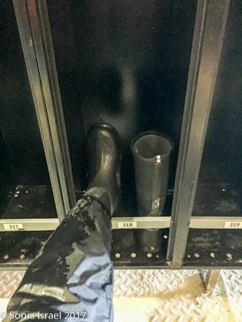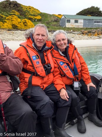 Before long we anchored at Settlement Harbor at West Point Island, West Falklands. After breakfast they began calling the zodiac groups. We were group B. We layered our silk underwear, light wool layer, fleece layer, big orange jacket layer, gloves, hat, camera, plastic bag to keep camera dry and muck boots. And of course, life jacket. And off we waddled, down to the mud room where our muck boots were stored, and put them on. We scanned out, cleaned our boots and climbed into our zodiac. Clean our boots on the way out? Yes, to keep from contaminating the islands with foreign seeds or bacteria. So we cleaned our boots and stepped into disinfectant on the way out and again on the way in. And, while we are on the topic of the mud room, the lockers were set up in a way that we could use the rung to take off our boots. So much easier than trying to just pull them off!