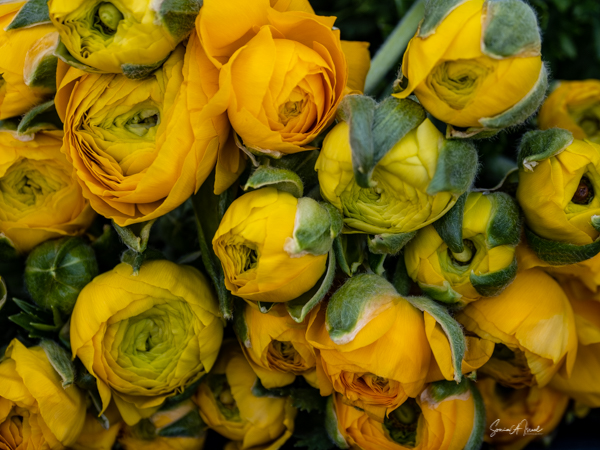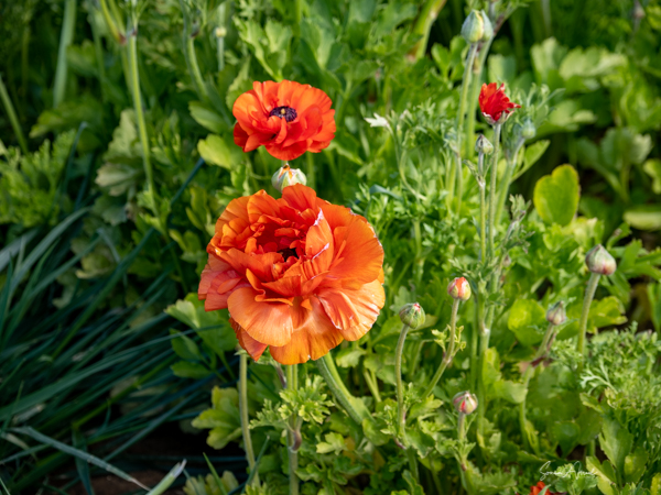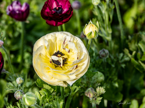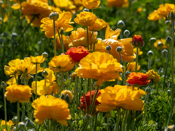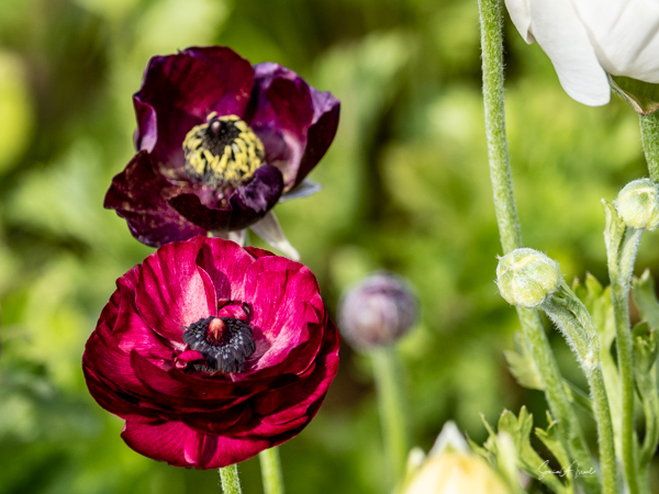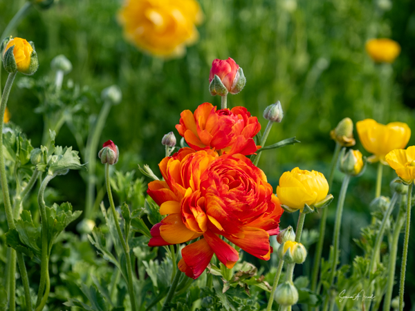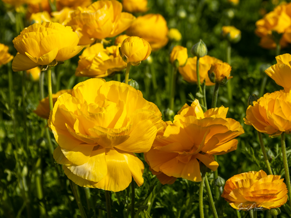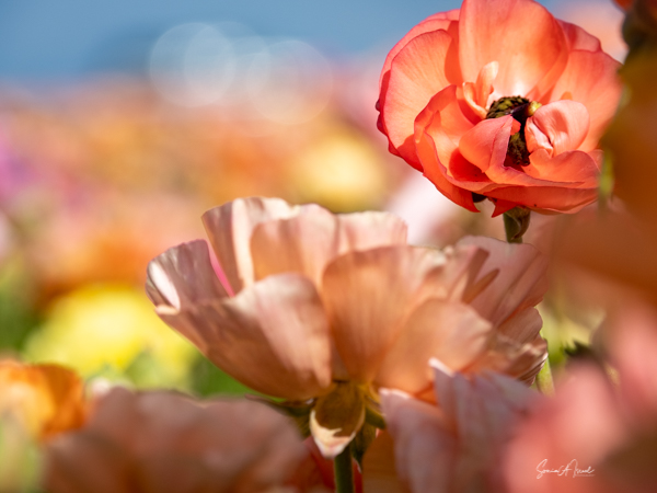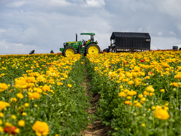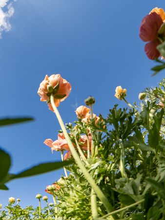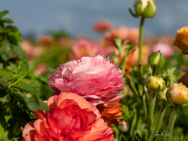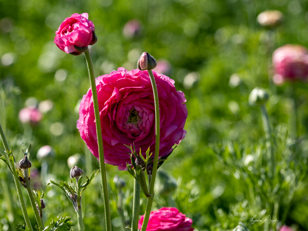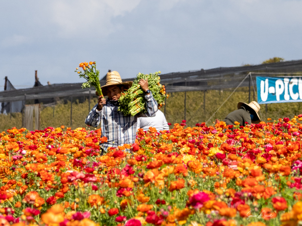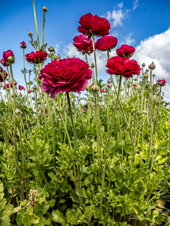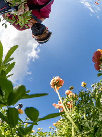 It is the Giant Tecolote Ranunculus that is primarily grown here, although there are a few acres of other flowers and of blueberries that you can pick. The ranunculus flower is native to Asia Minor and is a member of the buttercup family, thus it is also called the Persian Buttercup or Ranunculus Asiatic.
