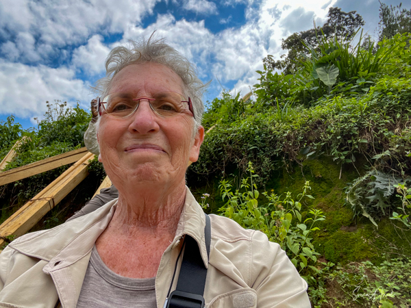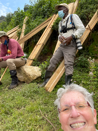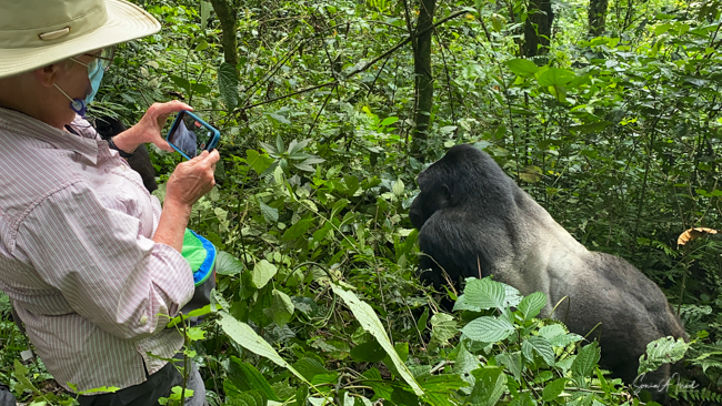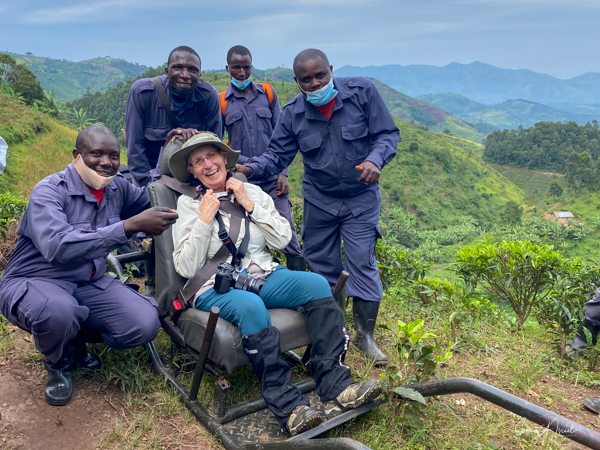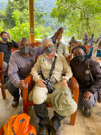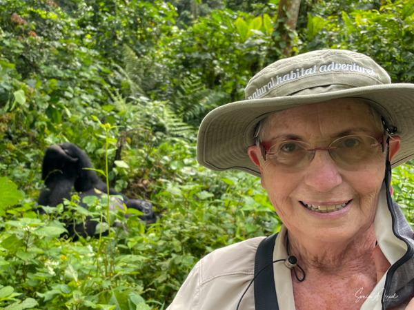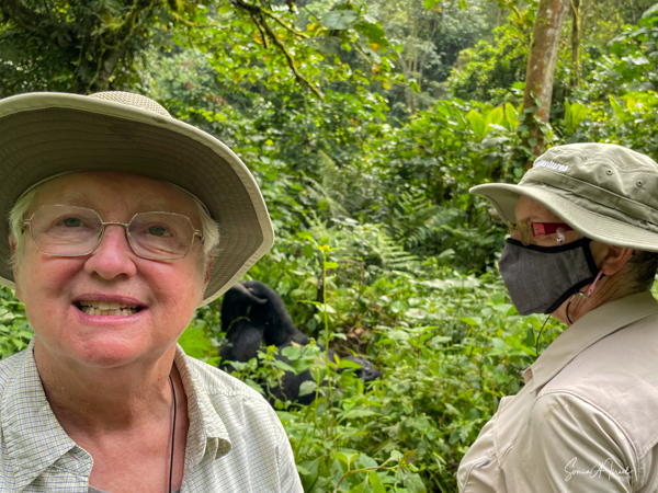 We stopped at the edge of the forest where they set me down as the gorillas were right there. We took our last sip of water since we were not allowed to eat or drink around the gorillas, and made our way into the forest, one porter on each side of me holding me up and helping me through the foliage. The three of us were ahead of the rest of the group, and suddenly, there was a large silverback gorilla looking right at me. And then he started running, looking like he was going to run right into me. The porters yelled, “shoot, shoot” (the camera) but I froze and found myself backing away instead of taking pictures. The gorilla of course ran right past me and the moment was over. A bit scary? Yes, but in truth, gorillas are peaceful, gentle and very social. Was it exhilarating and understanding of this force of nature? Yes! A bit later a second gorilla did the same thing but this time I had the camera ready and took shots. And Paul was there to video the whole thing. Debby and I both got to be so close to the gorillas. Amazing!