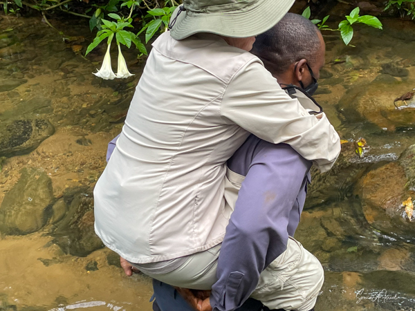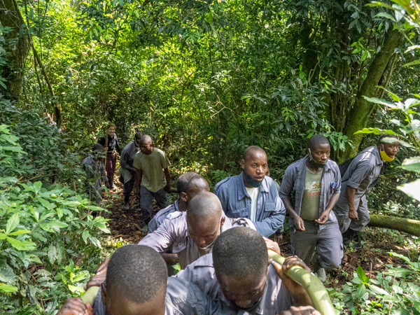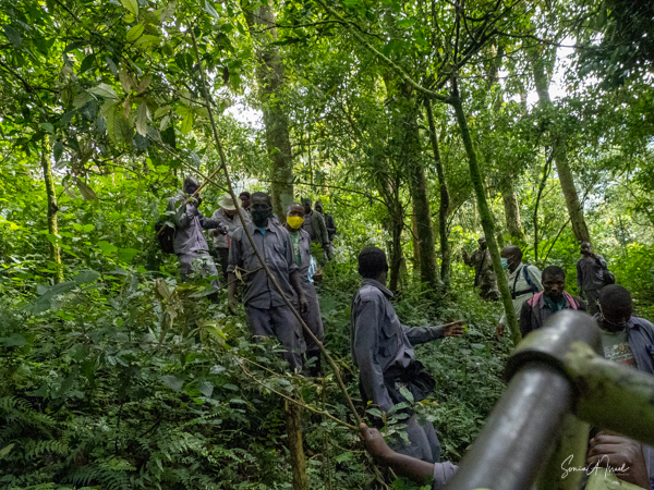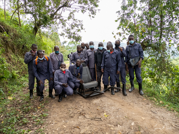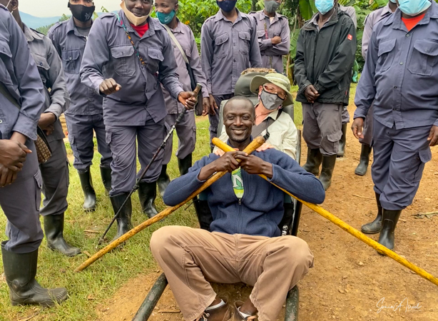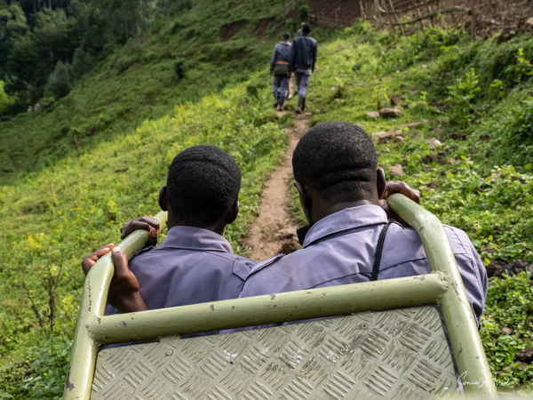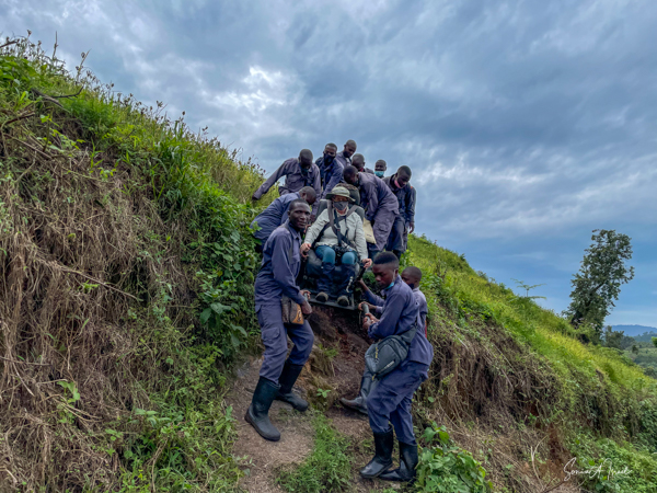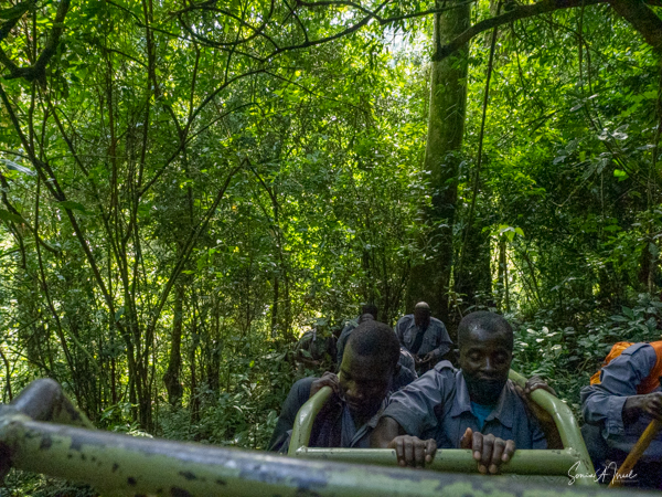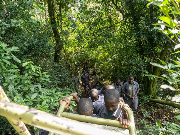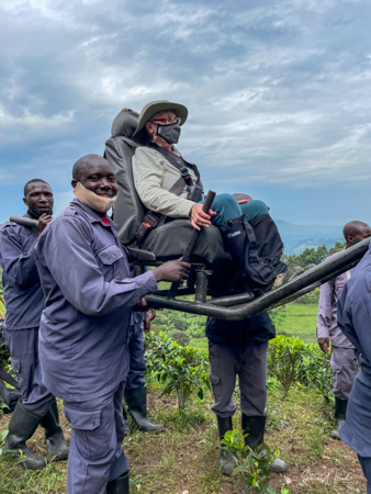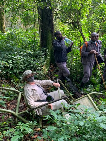 We got to a small bridge crossing the river, and I got out and walked over it. On the other side, I got back into the chair and before I knew it I was being carried into the forest. They turned me around and carried me backwards up through the vines and trees and leaves. I have no idea how they did that. The foliage was thick and once again, the front guide was using a machete, cutting the branches and vines trying to make a path. One of the porters used a walking stick to lift higher branches out of the way of my head. I was overwhelmed with awe at their ability to carry me like this. This is what they do to ensure that everyone, no matter their ability, can experience the beauty of the gorillas.