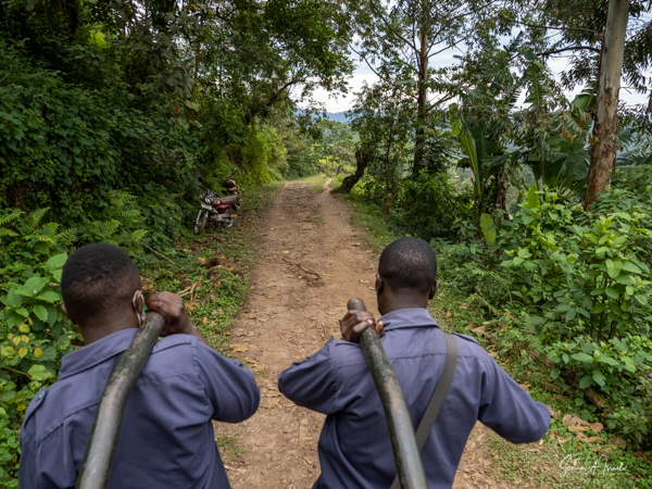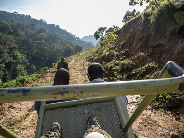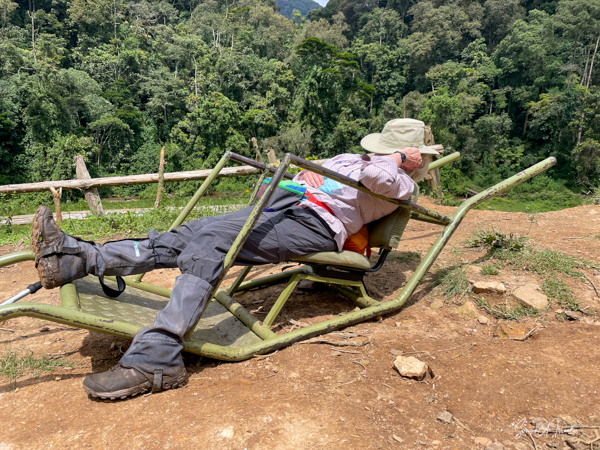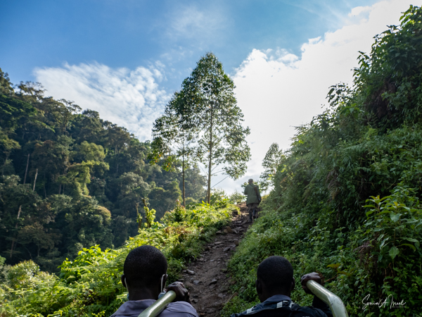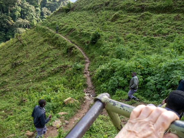 Bweza live in the Rushaga section of Bwindi. I used the “bush helicopter” again, although this time is was a low back seat that was very uncomfortable. The trek began at a narrow, wooden bridge that had definitely seen better days. We had to cross it sideways, side stepping across. Notice the second part which is just logs. On the other side, I boarded my helicopter and off we went, while Debby held on tight to her two porters.