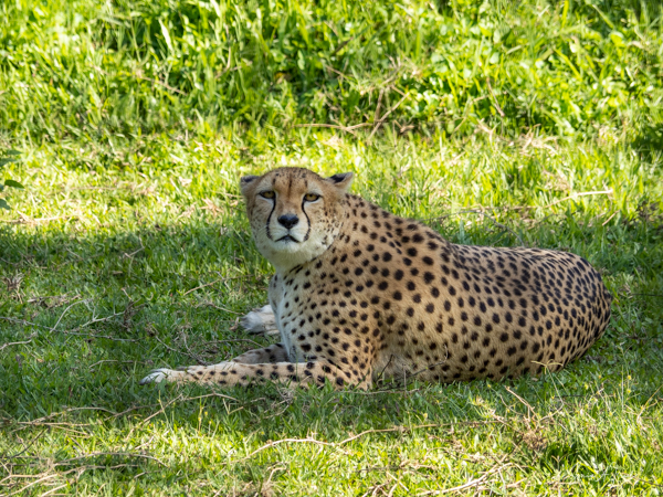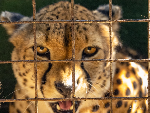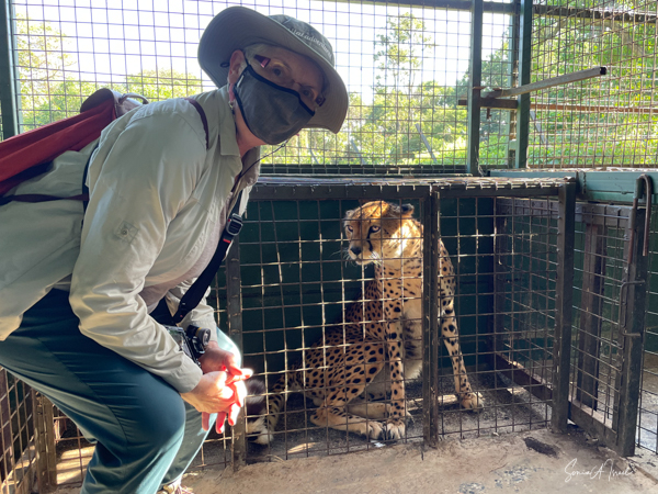 Next we went to see the two cheetahs who were outside in a large field. I have seen many animals in the wild, but never a cheetah. This too was not in the wild, but closer than I’ve ever been. The guides coaxed the cheetah into the cage by calling to him and holding a large piece of raw meat. At first the cheetah just didn’t care, but eventually he made his way into the cage and the guides closed the gate on either side. Debby and I then took turns squatting down to take a picture with the cheetah. But really I preferred to study he face. Such intensity in his eyes. What was he thinking? Perhaps, “What am I doing here and where is that meat they teased me with?”