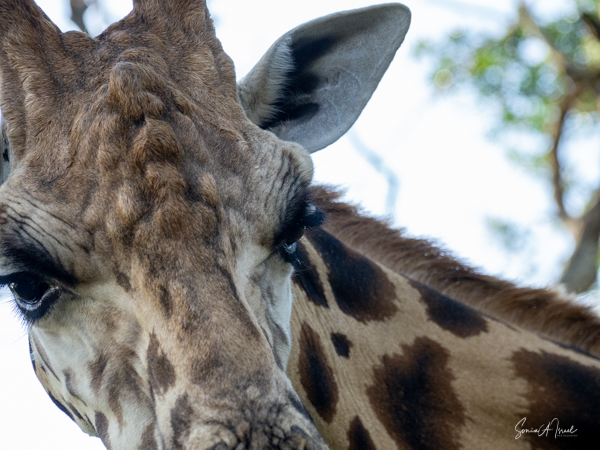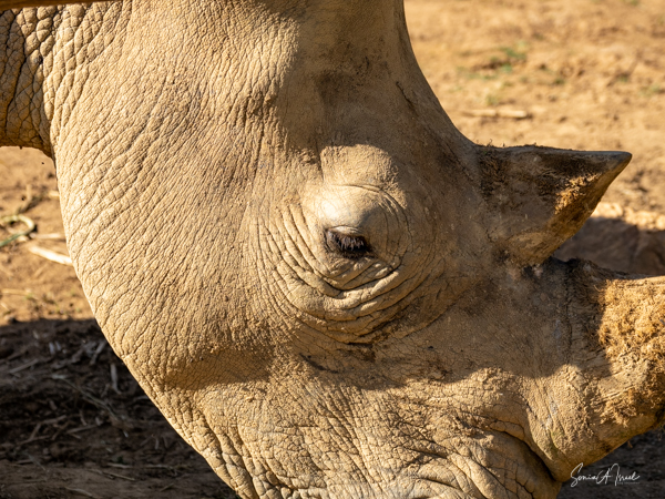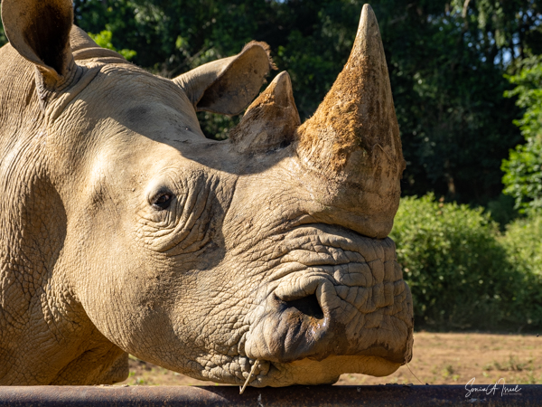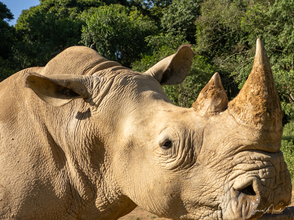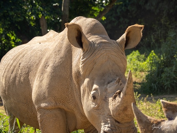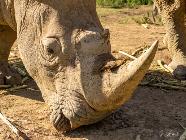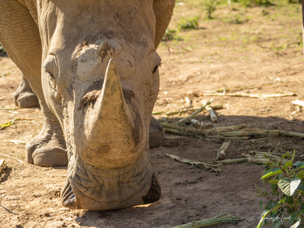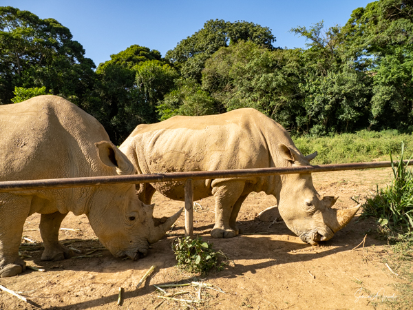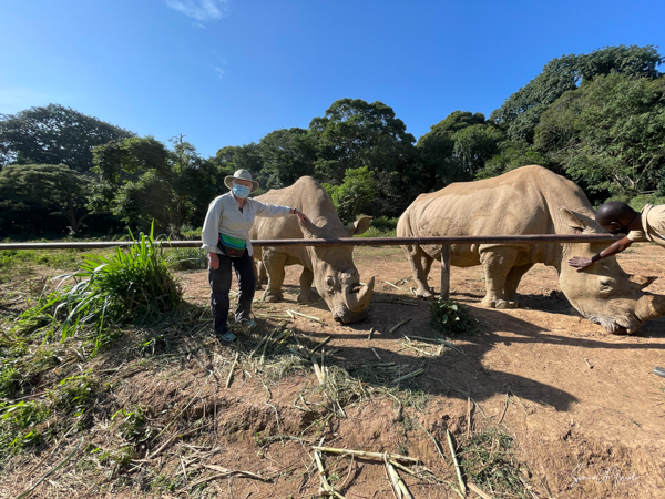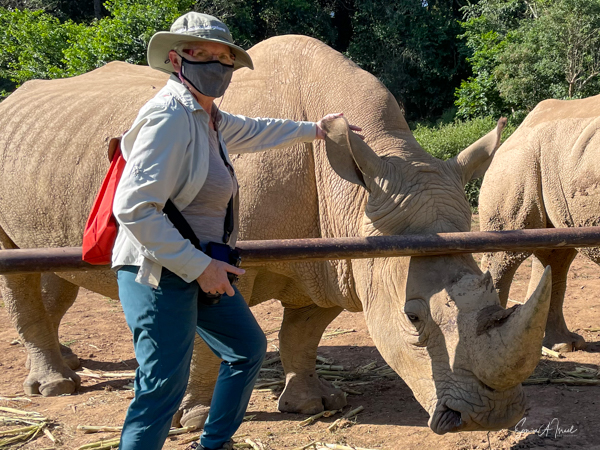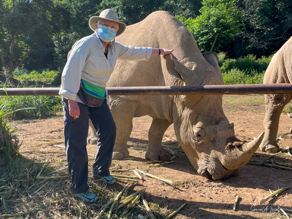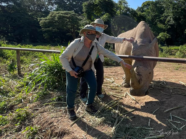 But one of the best parts was getting to pet a white rhino. Rhinos are so endangered and here were two being saved and protected. The guides called them over by name (all the animals have names here) and enticed them with food. The two brothers sauntered over and started eating. That was our cue to walk over and pet them, on their back, or ear or on their horn. Their skin felt just like it looks – rough. But their ear was almost furry and the horn was not as hard as I thought it would be. I must admit, as you can see in the pictures, I was a bit hesitant. But the truth is the rhinos totally ignored us and just enjoyed their snack.