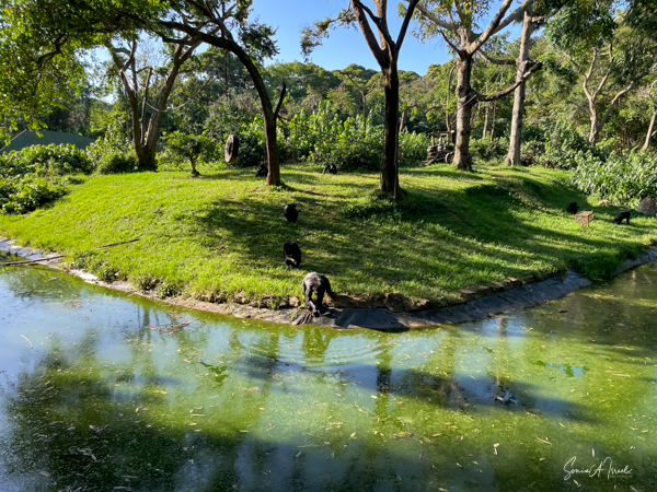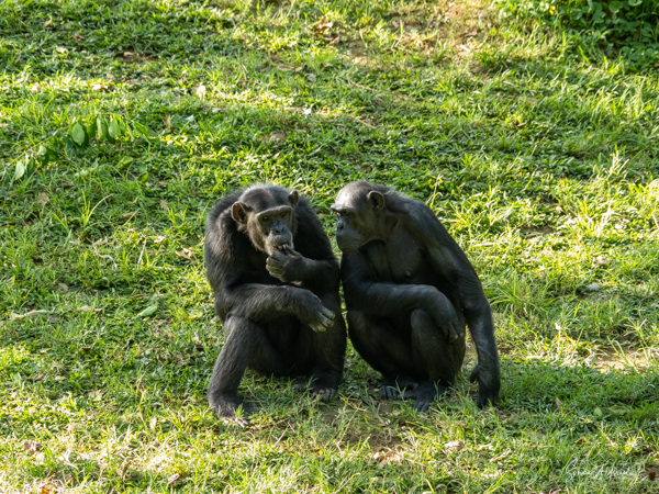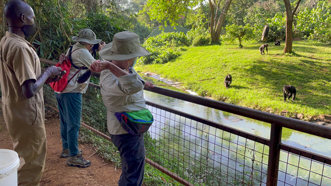 Next it was over to the chimps. We had just seen chimps in the wild so this was less exciting. They had us feed them by throwing eggplants at them. They were sitting across a moat since they don’t particularly like going into the water. But I’m not such a good pitcher and my eggplant often landed at the water’s edge. One chimp kept climbing into the water to get the food. One used a stick to bring the eggplant closer to him. Yes, he used a tool. They others just ignored me and the eggplant. Except for one chimp who sat on the side and clapped each time I threw the eggplant. I know he wasn’t really clapping for me, but it did give me a chuckle.