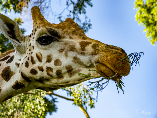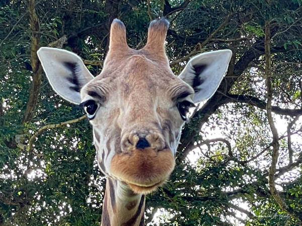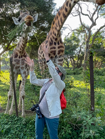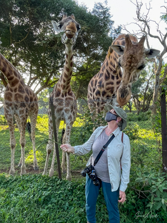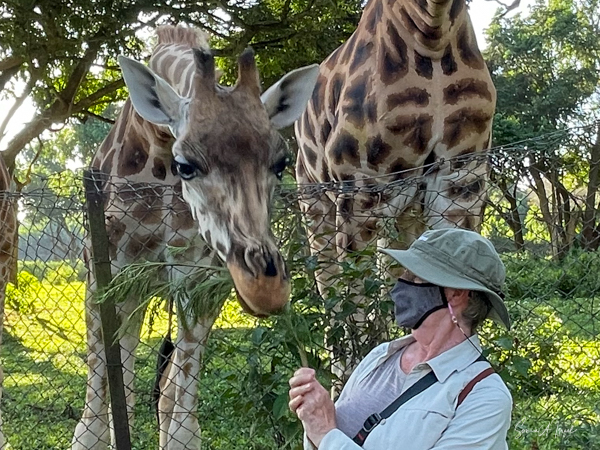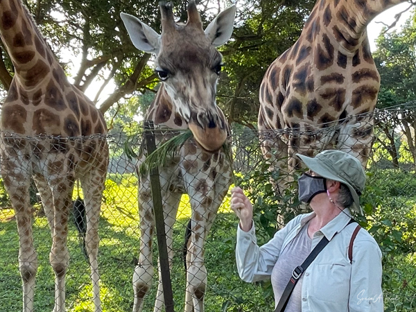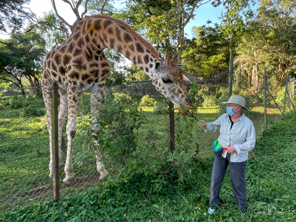 Feeding time was not over, as next we got to feed the giraffes. They called one giraffe over to us, but her two companions came along. After all, there was free food. Debby and I were handed some long grasses which we held up for the giraffe. The giraffe literally pulled it right out of my hands. I tried again and had to hold on tight with two hands. That was one strong giraffe.