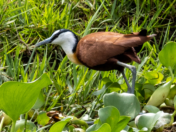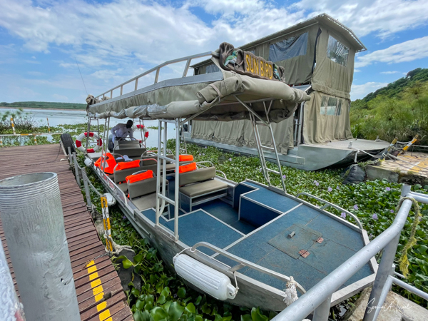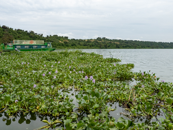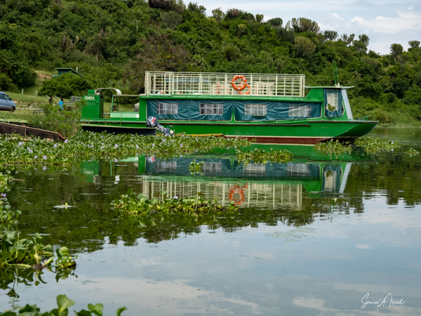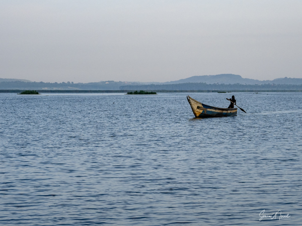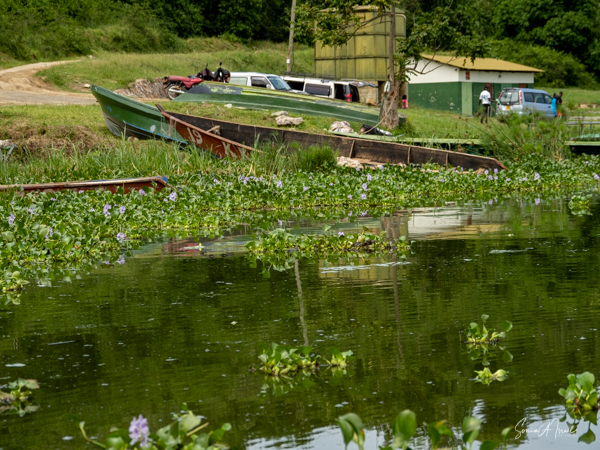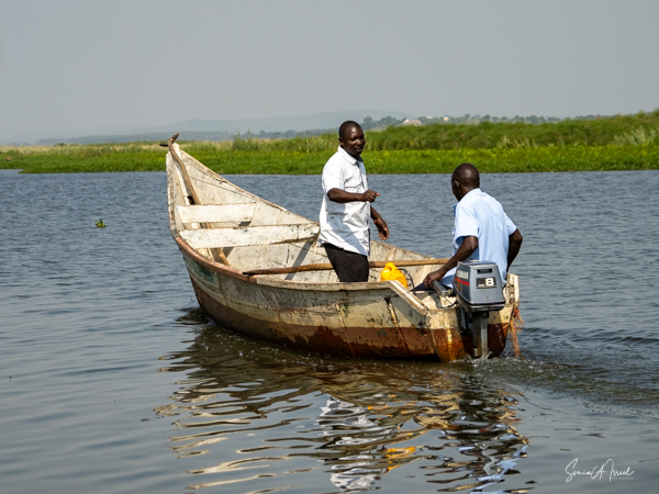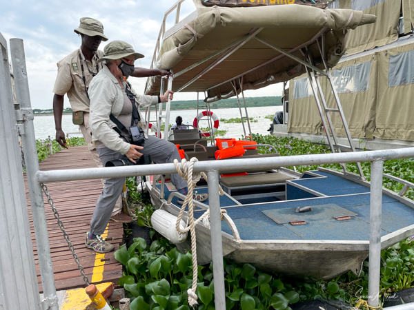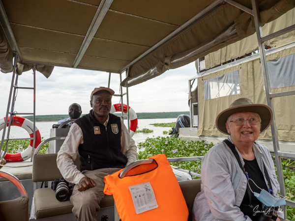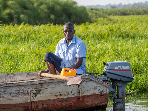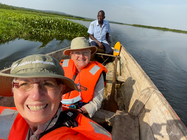 We donned life jackets and boarded a small motorboat and sailed across Lake Victoria towards the marshy, swampy area. Birds were everywhere but there were few other boats. After about 15 minutes, we came upon a canoe with two men in it, Hamilton and one other whose name we never learned. We carefully climbed into the canoe and were seated on hard wooden benches. And off we went right into the marsh. At times we motored, but at other times, the men had to use their long stick to push the boat in and out of the vegetation. There were lily pads and papyrus everywhere.
