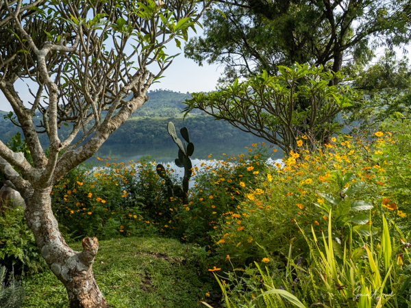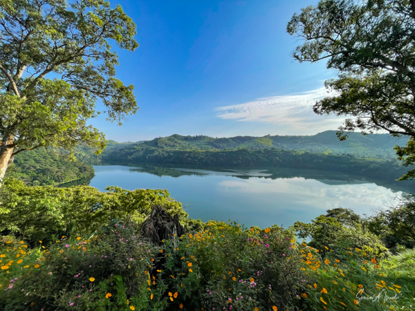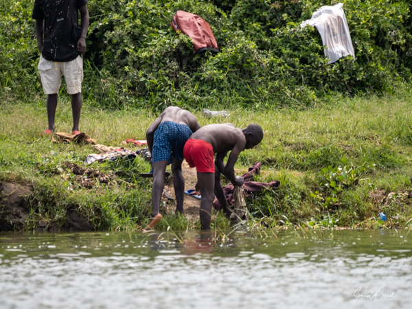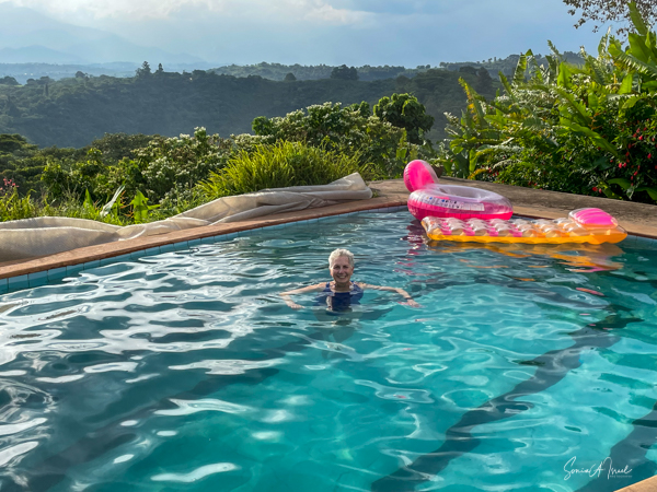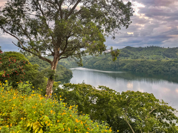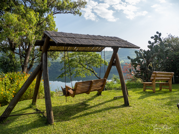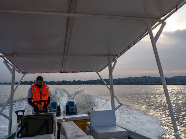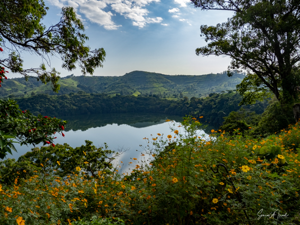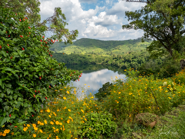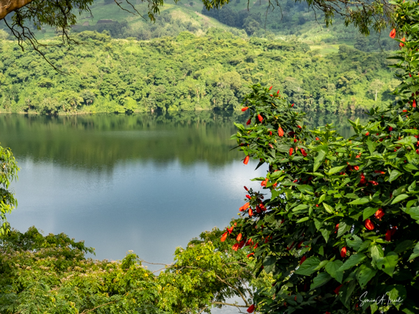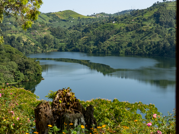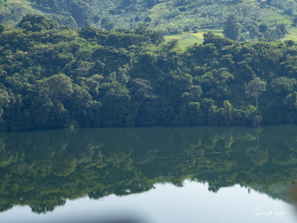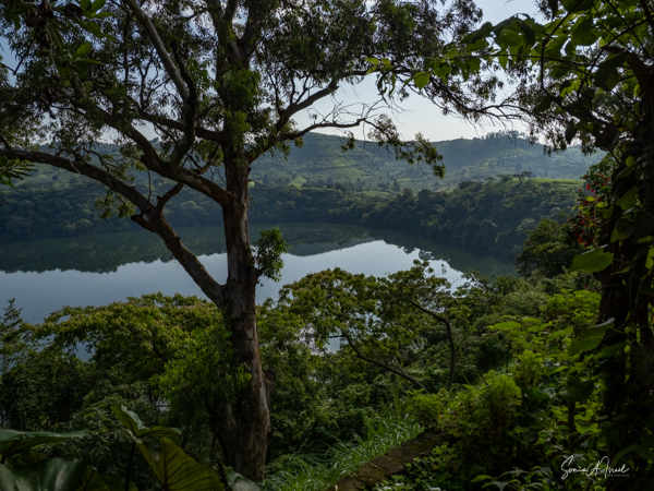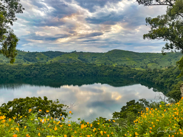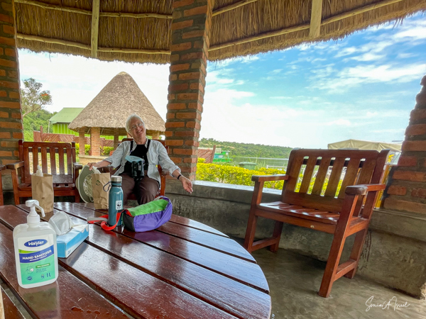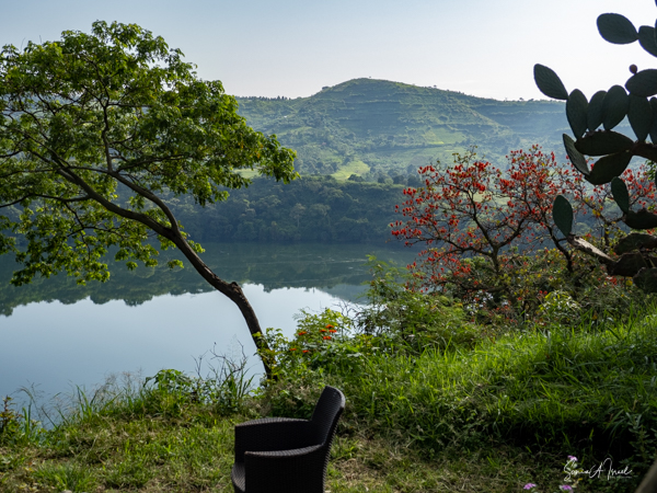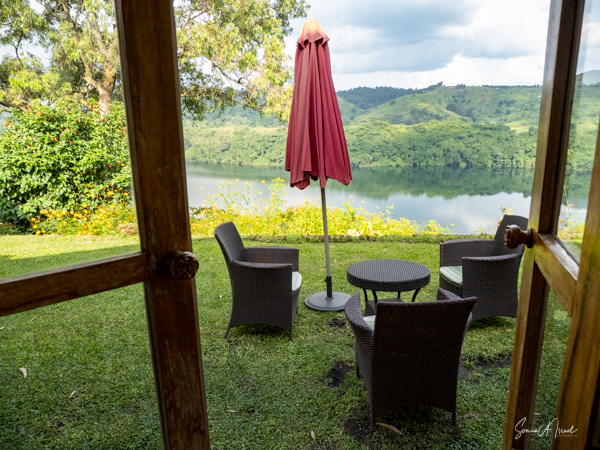 We slept a bit later, I went for a swim in the pool overlooking the valley and mountains (with the Democratic Republic of the Congo on the other side), had breakfast on the deck overlooking the lake, and had time to write and edit pictures. I could hear a man singing down below on the lake. Matt was paddle boarding on the lake. The trees reflected in the water. It was quiet and peaceful.