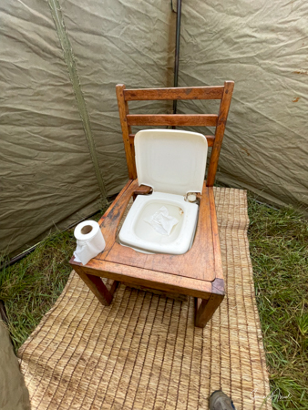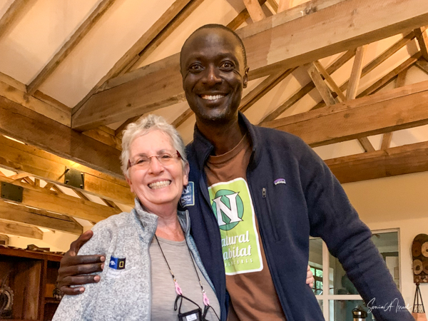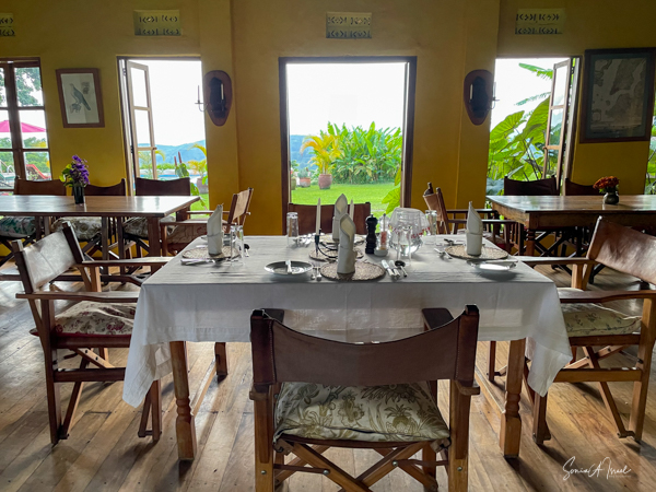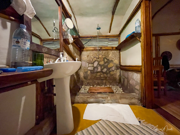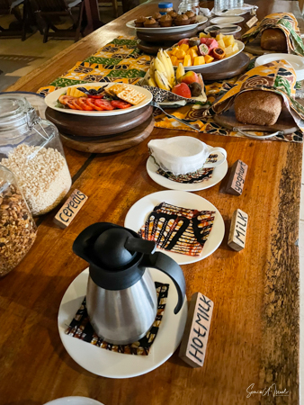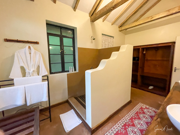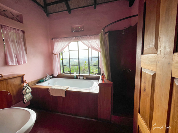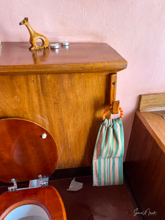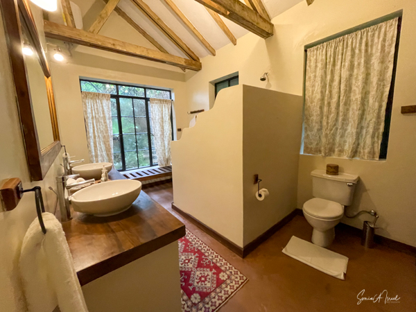 The 8 cottages are beautifully decorated, each a bit differently and overlook the valley. The bathroom had a fabulous, private view of the hills, same as from our front porch, and the water was heated via a wood burning stove. And the giraffe in the picture? You lift it to flush the toilet.