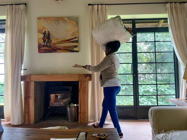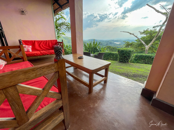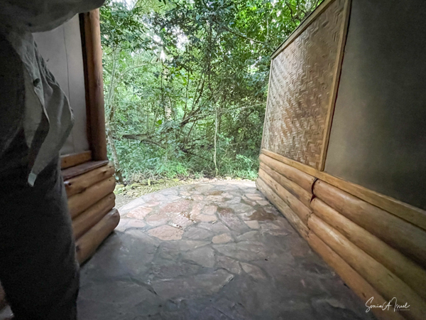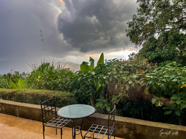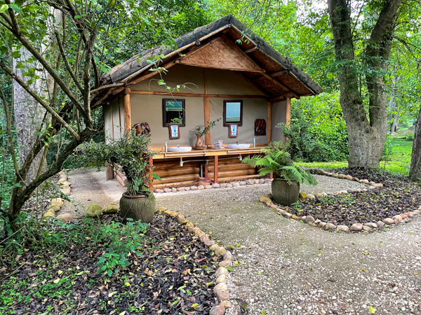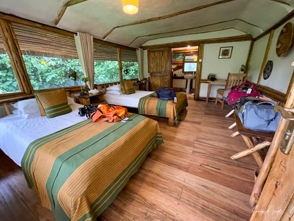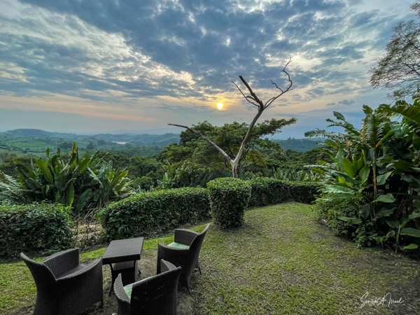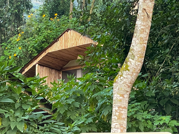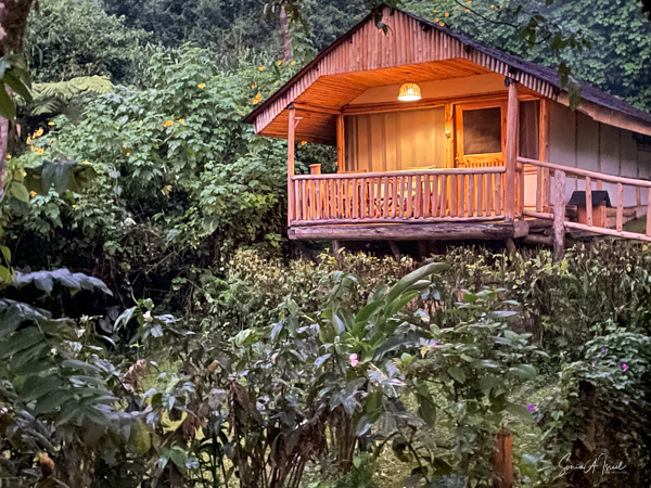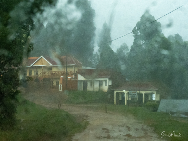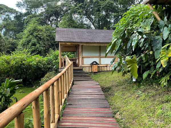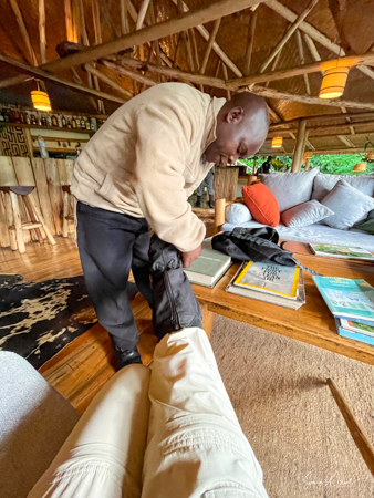We hit the road for the seven-hour drive to the southern part of Bwindi. Seven hours on a bumpy, pothole ridden, dirt road. I felt like my body was in a washing machine. Not a good feeling. But as usual, Sulai was amazing getting us over these roads. We arrived at our most elegant lodge yet, the Clouds Mountain Gorilla Lodge, just as the skies opened and it began to pour and hail. We sat in the car for a few minutes until the staff came out with umbrellas to great us.