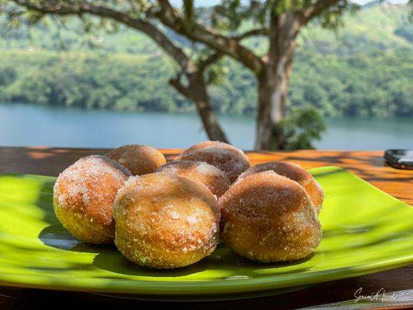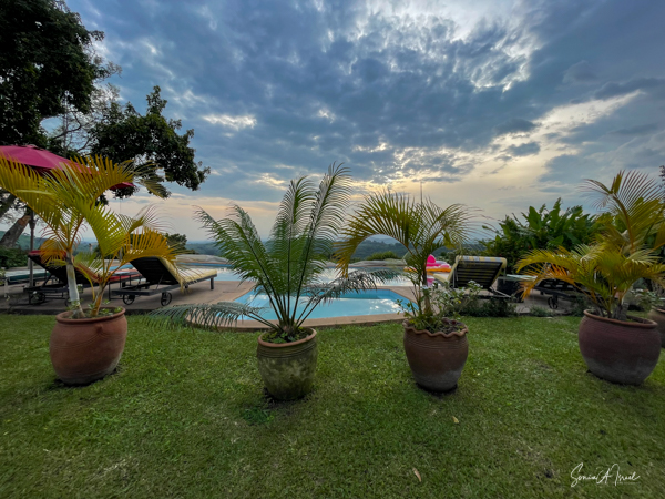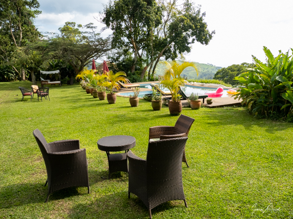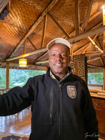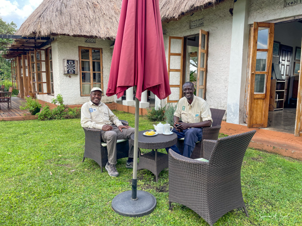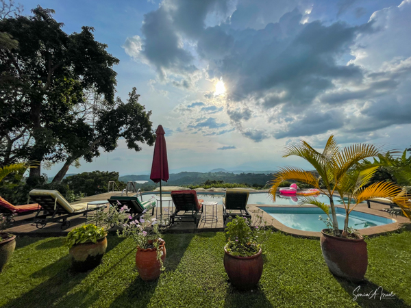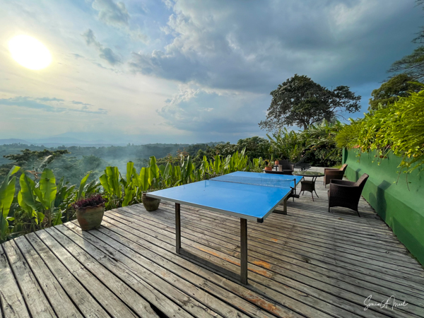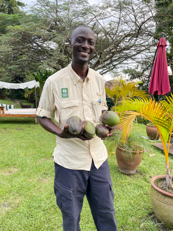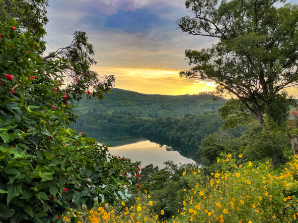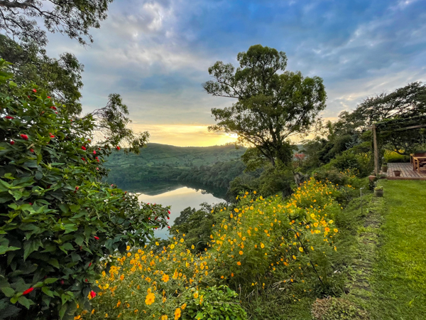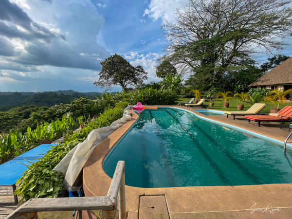 The lodge and grounds are beautiful, on one side overlooking the Rwenzori mountains on the border with the Congo (with beautiful sunsets) and on the other overlooking Lake Nyinambuga (with beautiful sunrises), part of the Buyuruguru Crater Lakes. The grounds include a swimming pool (which I enjoyed daily), a sauna with a wood burning stove (which I also enjoyed), a ping pong table, full gym (the treks were enough exercise for me!), and access to the lake for paddle boarding or hiking or swimming. There were fruit trees, including an avocado tree with huge avocados which Sulai enjoyed picking.