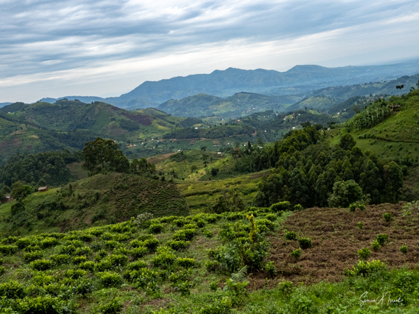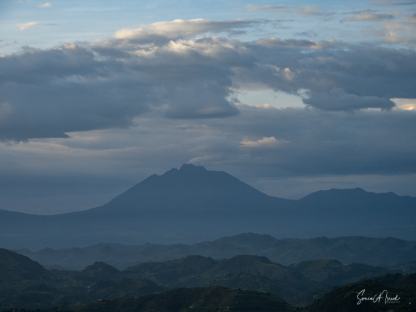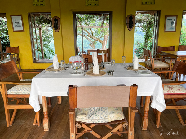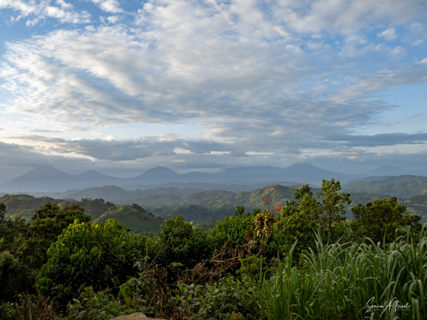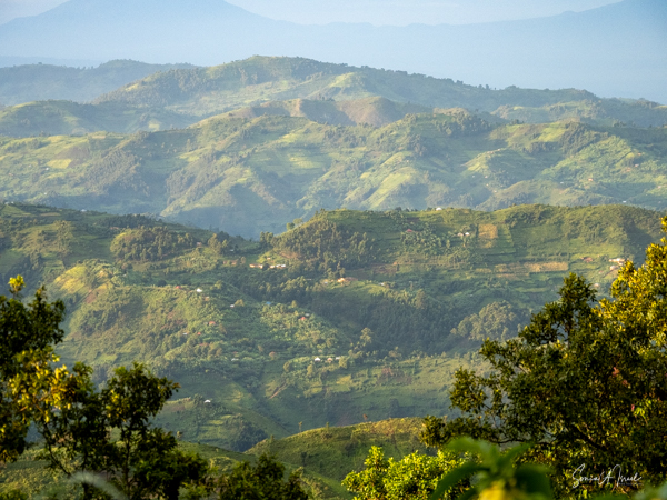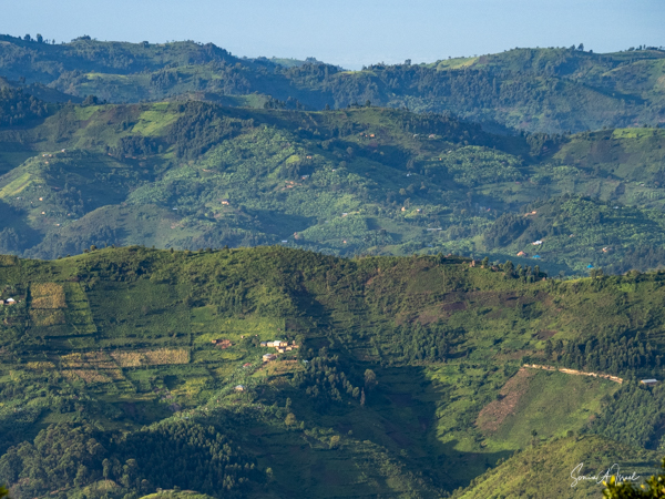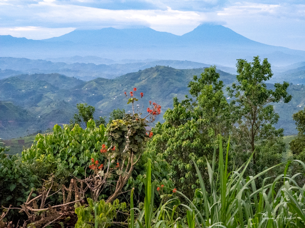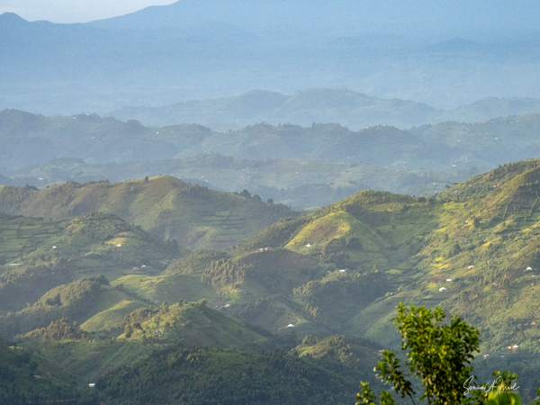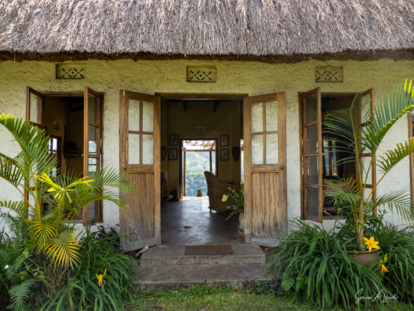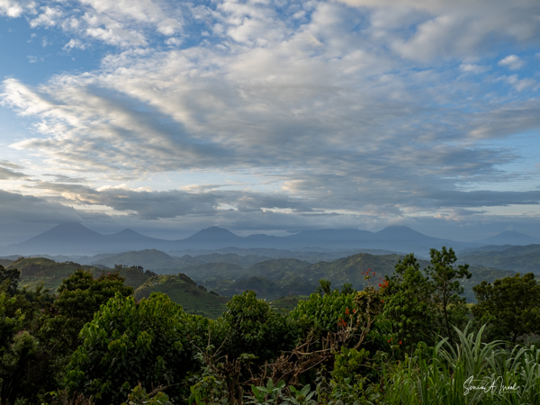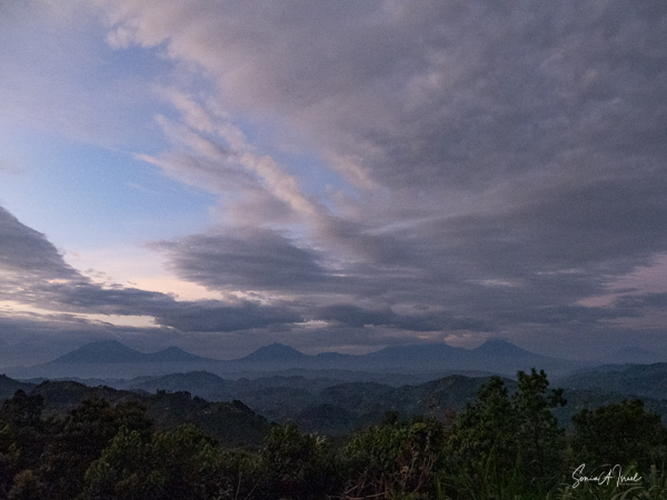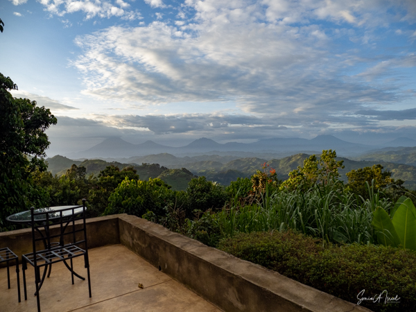 This lodge is set in the forest on the edge of the Bwindi Impenetrable Forest. Once the skies cleared, over the next three days, the views of the five Virunga Volcanoes of Rwanda and the Congo down below were spectacular.