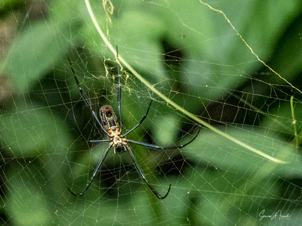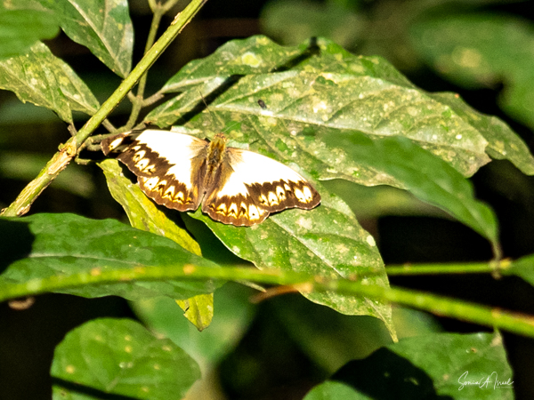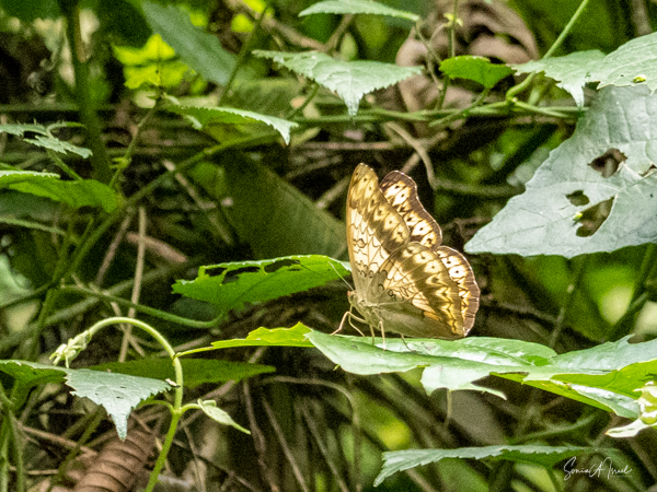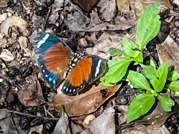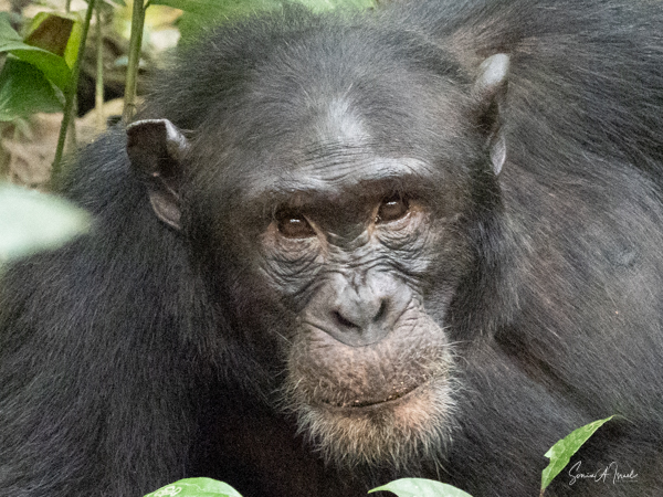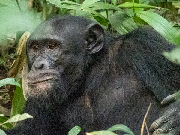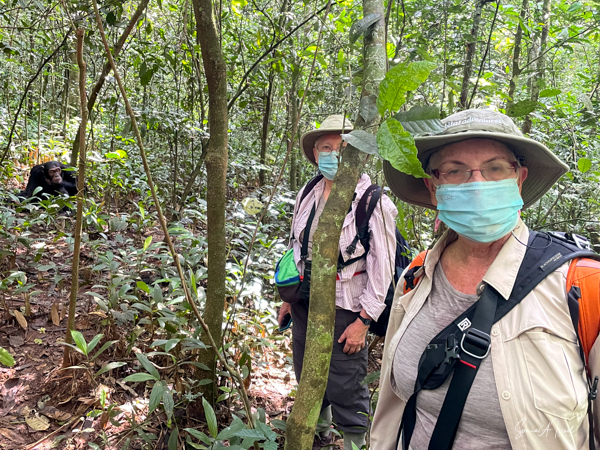 We parked our car and were invited into a room set up with theater style chairs for our briefing. We learned that before every trek, you have to sit through a briefing. Don’t feed the animals. Wear your masks. Don’t get too close to the chimps. Our group of four were placed into the capable hands of Gordon, who has been guiding here for six years. He had on fatigues, wore bright blue rain boots and carried a rifle. Why a rifle? In case we ran into an elephant that had to be scared away; he would only shoot into the air. When asked, he told me he had seen 3 elephants in the last six months. Gordon welcomed us in a speech clearly memorized and off we went. At first there was a path that we followed, but before long we began climbing through the forest, over logs, some almost a foot high, over and through plants. There was no path, just follow the leader. The air was pungent with the smell of figs. That’s what the chimps like to eat. We went uphill. We went downhill. There were butterflies everywhere, but rarely did they land for more than a few seconds. We saw the most beautiful green butterfly, but just could not grab a photo.