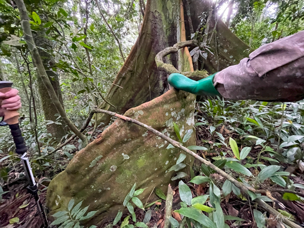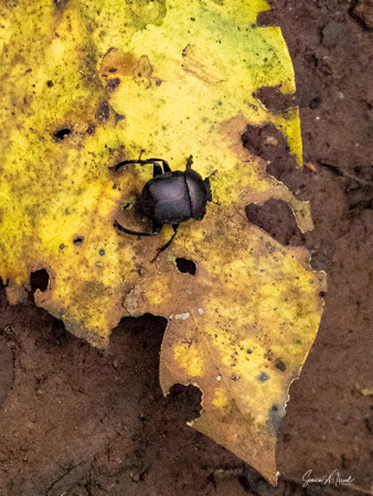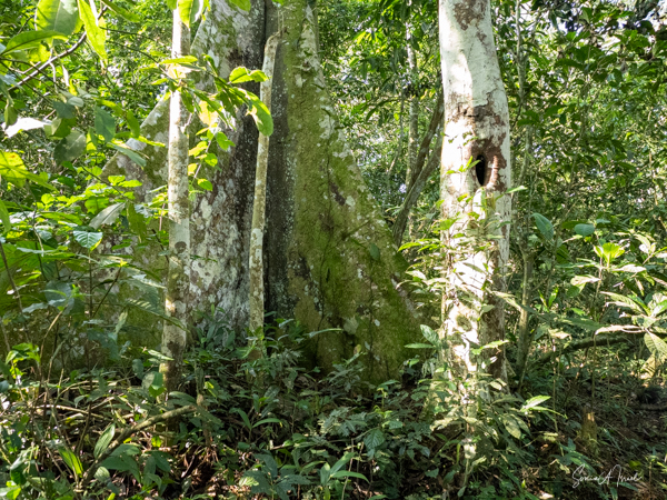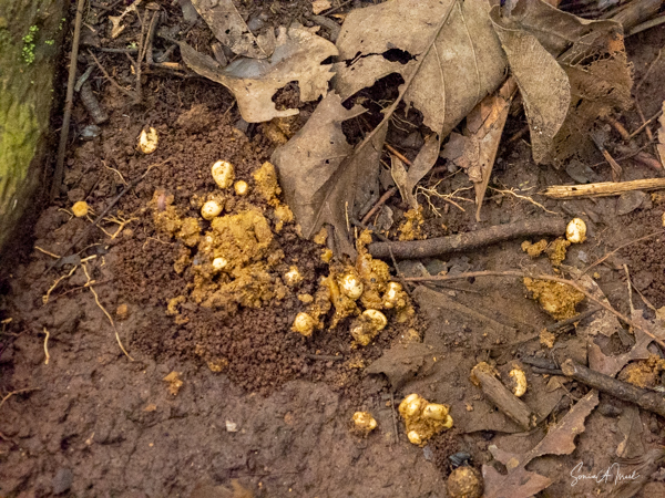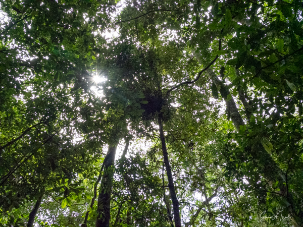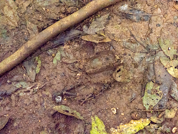 They travel in smaller groups, on the ground, using their knuckles which keeps their hands clean for eating. We saw quite a few knuckle prints in the mud. They prefer to find fruit on the trees. But if they find fruit on the ground, they will clean it off first before eating it. We also saw remnants of poop, which looked very orange from the fruit, and dung beetles enjoying their feast. The dung beetles eat the poop (i.e, the dung) and then spread the seeds around the forest. And thus the forest continues to grow.