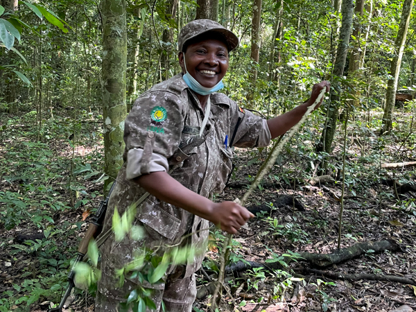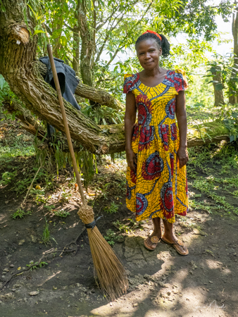 We headed back into the forest, again starting on a path, but quickly veering off into the wilds of the forest. Jessica found a guinea fowl feather and proudly wore it in her hat. We trekked and trekked, at times over rotten wooden bridges covering deep mud. At one point, Jessica made a walking stick for me, which helped tremendously. She also pulled off a branch with lots of leaves on it and used it as a fan to cool me down.