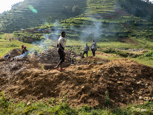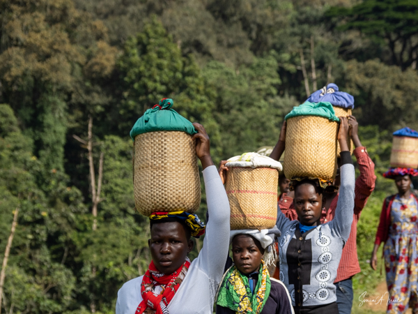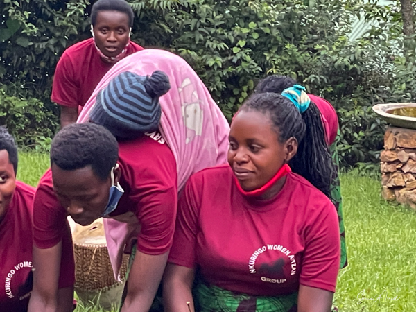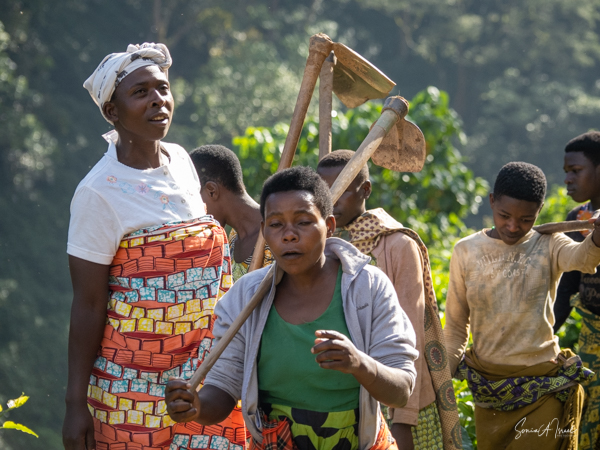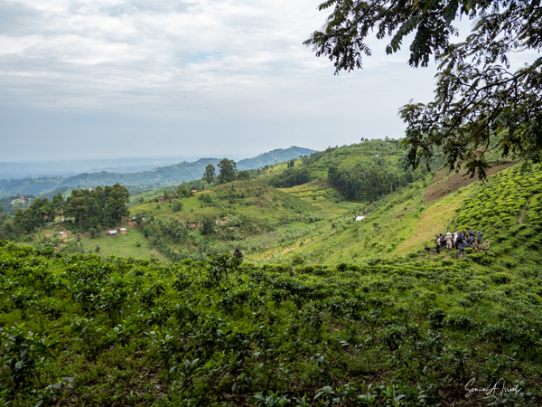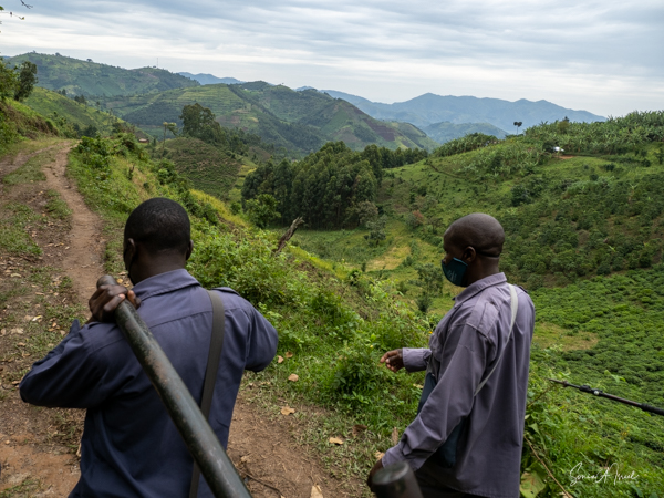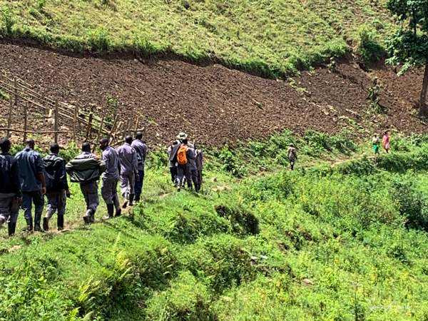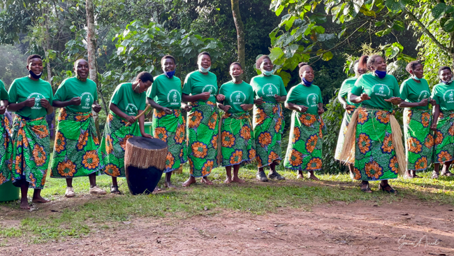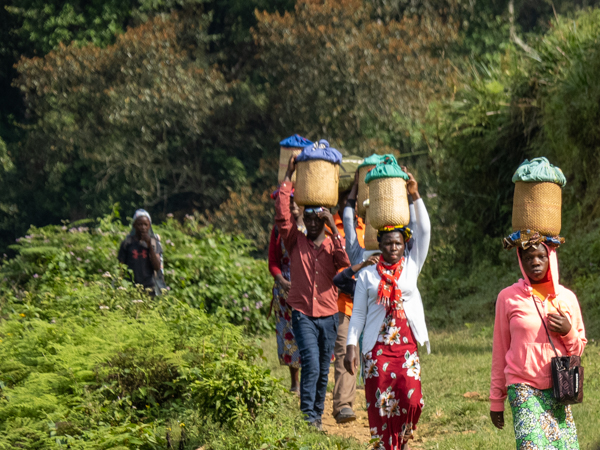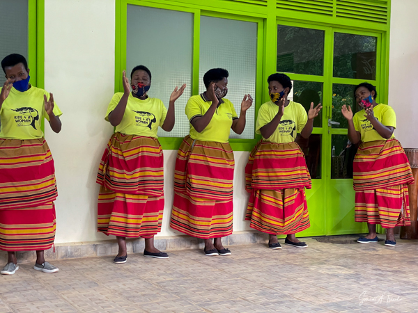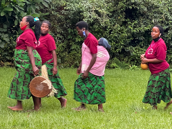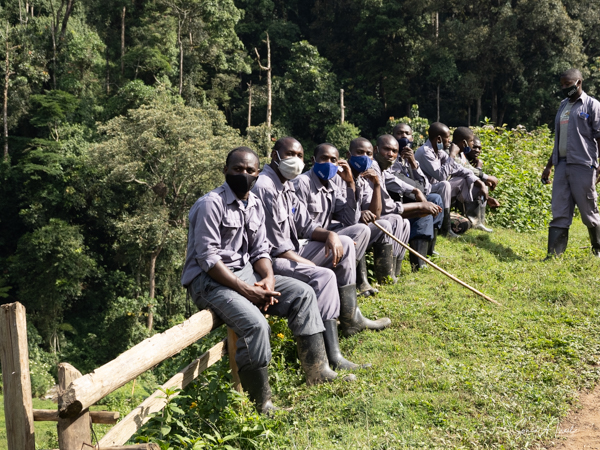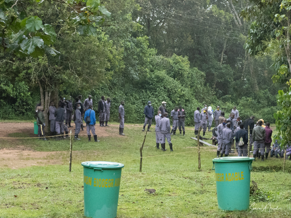 The next morning we got up early again, put on our trekking clothes and knee-high gaiters, and set off for the to our check-in location. There were two rows of unmatched chairs and and we took our place to wait for our instructions. Once again there was a group of ladies, the Rushaga Community Handicraft Group, to entertain us. I guess this is a thing. And in the distance, we could see all the porters waiting to see if they would be chosen, if they would have work that day.