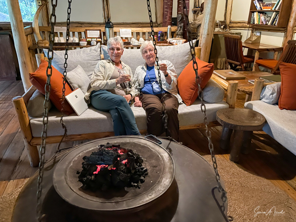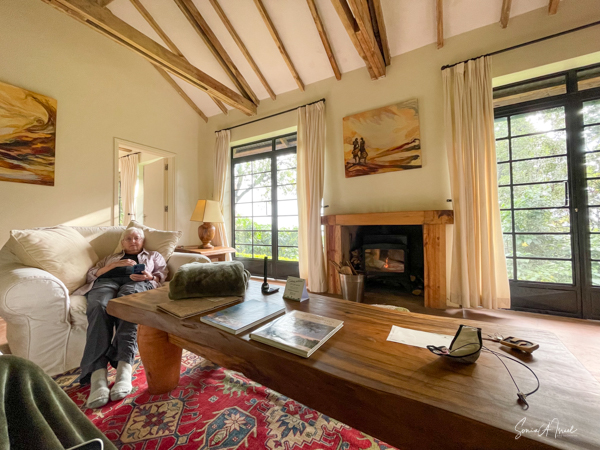We were welcomed again with a cold drink and a warm towel, and Des and his wife oriented us to the lodge. Since it was still pouring rain, we made ourselves comfortable in the living room, by the fireplace to wait it out. The rain finally let up and we were led down many, many steps to our cottage, number 5. There are 8 cottages in all, all at different levels. I think ours was the one with the most steps to it. Lucky us. But when we walked in, we were awed. We had a living room with a fireplace, which our butler lit for us, and two, identical bedrooms each with its own bath. Once again, WIFI was only in the public areas.