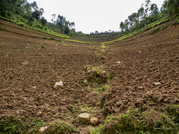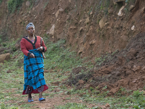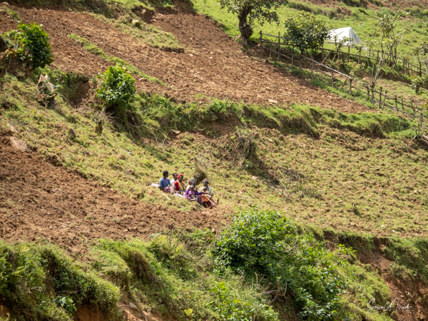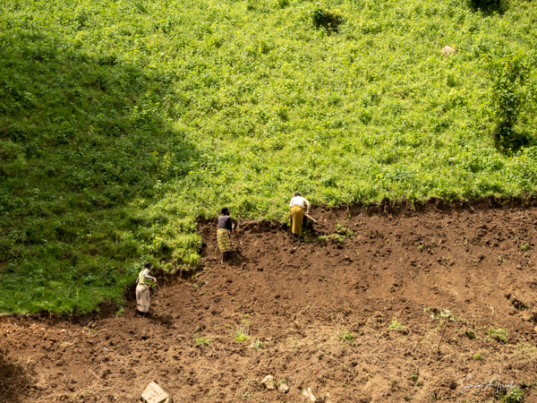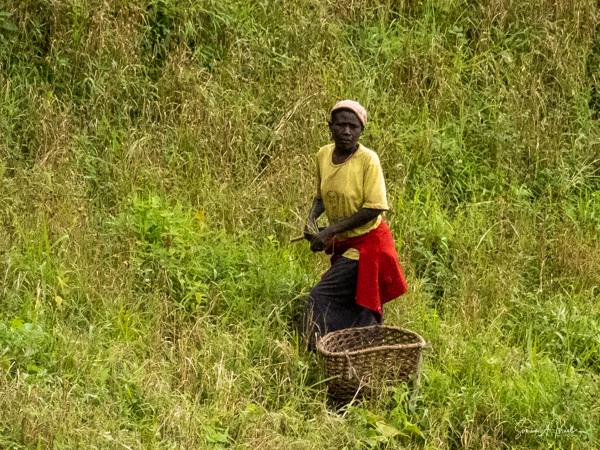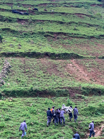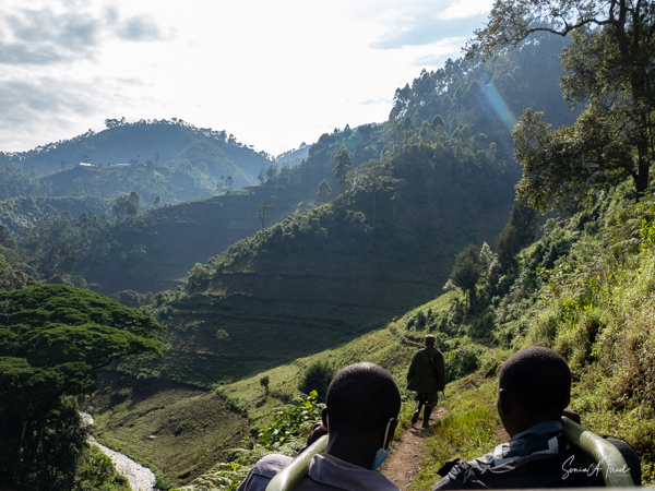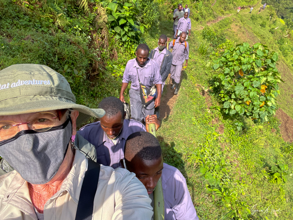 The trek took us through beautiful hills with local villagers walking to their farms or other places of work. The path was very narrow and most of the time had a steep drop on one side. I decided not to look down. I knew in my heart that they would not drop me but found myself often holding my breath and clutching tightly to the bars of the seat. There was a muddy looking river below and high mountains covered in terraces of vegetables above. The going was rough and as uncomfortable as I was, I was grateful not to be walking. There were lots of ups and downs which makes the trek difficult. The porters were all talking and laughing amongst themselves, in Swahili or other local language. I started a conversation with one of them and tried to explain why I need to be carried. High humidity, high altitude, etc etc. I told him I was older, taking off my hat and showing him my gray hair. You rarely see gray here here, in part because we didn’t see many older people. I asked him how old he thought I was. He replied, “45.” He meant it as 45 in Uganda is getting old, with a life expectancy of about 50. When I told him I was turning much older (no need to tell all of you my age!), he could not believe it.