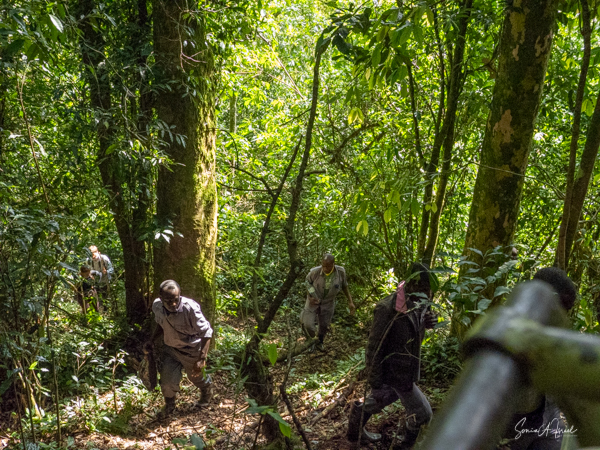 When we got close to the troop, they set me down and I had to walk. The two guides led me up more hilly terrain that was difficult walking. The forest here was thick and not meant for people to get through. We walked this way, following the gorillas, for our hour. By the end we had to trek down a steep hill and I found myself slipping down more than walking. I was so grateful to have two porters holding me up and keeping me from falling.