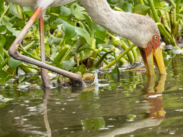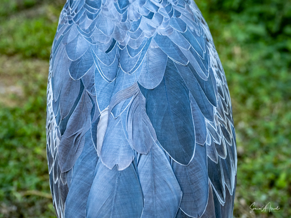 While the feathers of the shoebill are blue-grey, its bill looked almost variegated pink. And it was large, between 7-9 inches long with what looked like a hook at the end, but is actually more like a sharp nail. The shoebill has very large feet which enable it to stand on the aquatic vegetation while fishing.