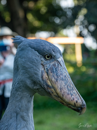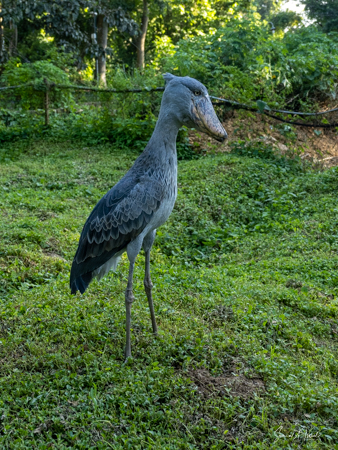 The shoebill is very prehistoric looking. Â Debby said it reminded her of Buckbeak from the Harry Potter movie, Harry Potter and the Prisoner of Azkaban. The shoebill, also called whalehead or whale-headed stork (which if you see the pictures, you will understand), is a very large (43-33 inches tall) stork-like solitary bird. Its name comes from its very large shoe-shaped bill. It likes to live in the swamp or marshes where it can easily find fish and water snakes to eat. We never saw it fly, but I was told that its wingspan can be over eight feet.