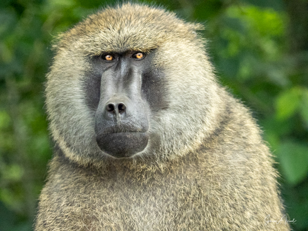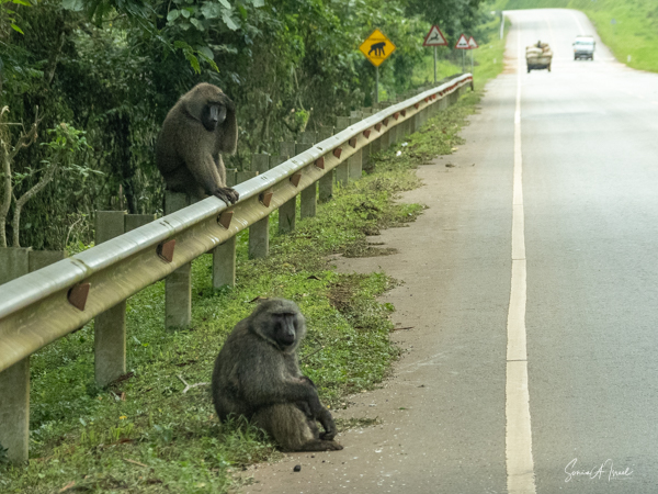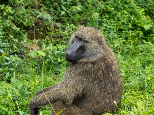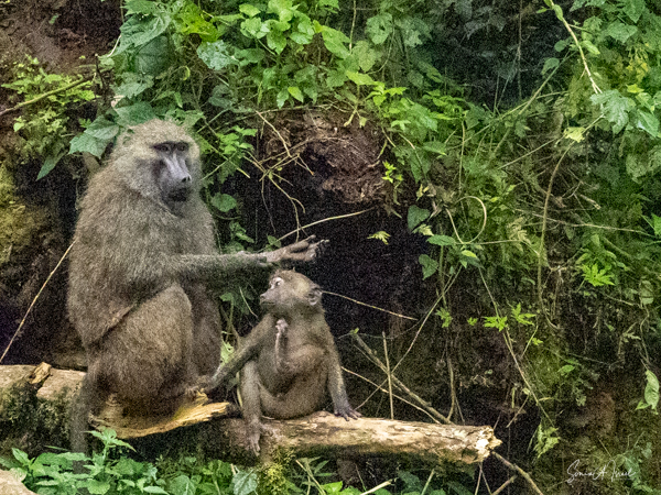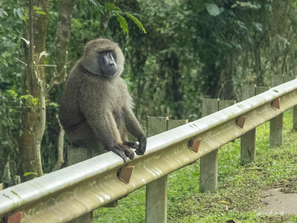 A bit further down the road we ran into our friends the olive baboons (the only type of baboon found in Uganda). We had seen baboons along the road the day before as well and would continue to see them during the entire trip. Sulai called them “the bad boys.” We closed our windows as they can be very aggressive, having learned that humans have food. There are signs everywhere about not feeding the baboons, but we saw people throwing bananas out the windows for them. This is so dangerous, as the baboons quickly learn to wait for cars rather than foraging for food in the forest. And then their offspring never learn how to find food. This is one way that animals become extinct. People can be stupid. Usually baboons are selective eaters, preferring insects and sometime fish, rabbits, fowl or even monkeys and antelopes. They forage for their food, and as mentioned, can be very aggressive when it comes to eating.