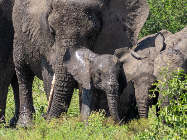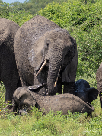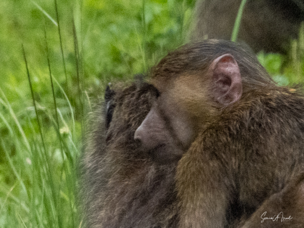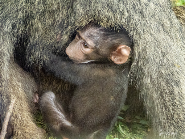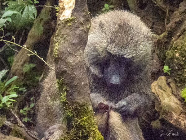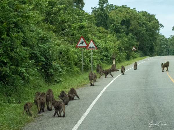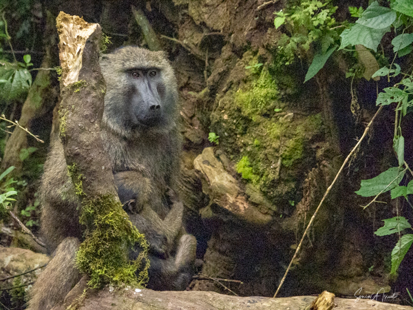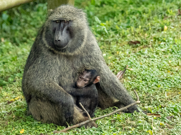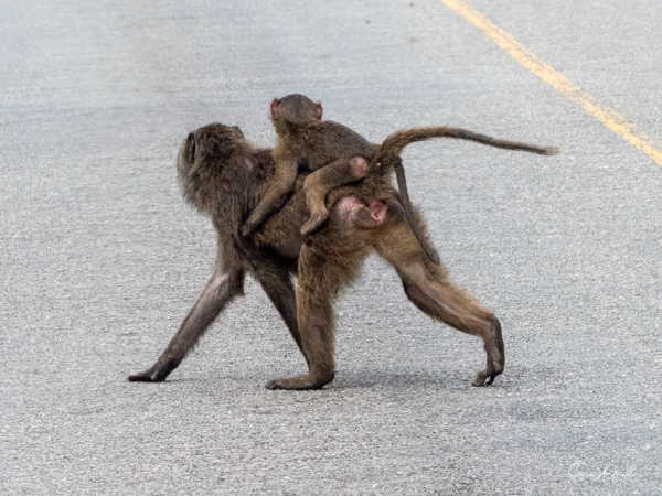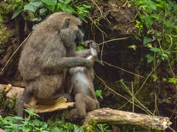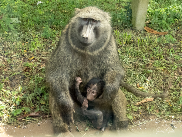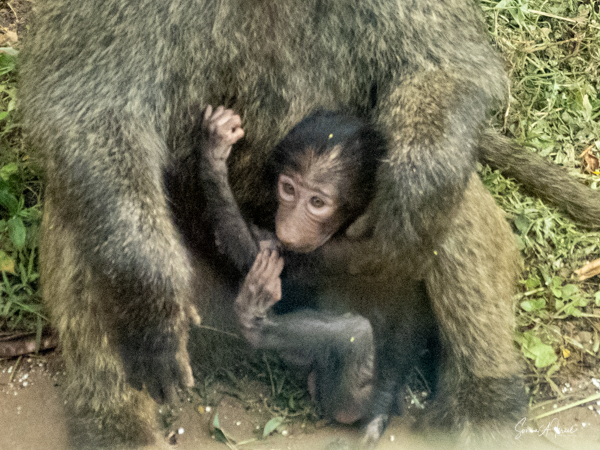 They are usually found in troops made up of family units of females with their infants and juveniles. The females are the leaders, unlike in gorilla or chimp troops. The males often leave the troop when they mature, returning to troops only when it is time to mate. The olive baboons are very social and as we saw, the troops can be quite large with 20-50 members. We often saw them sitting at the side of the road, grooming each other while the little ones played. But this group today was spread out across the road, keeping the cars at bay. There were lots of mothers with babies, either riding on their backs, or clinging to their underbelly. We watched them for a while, and then made our way past them very slowly and carefully.