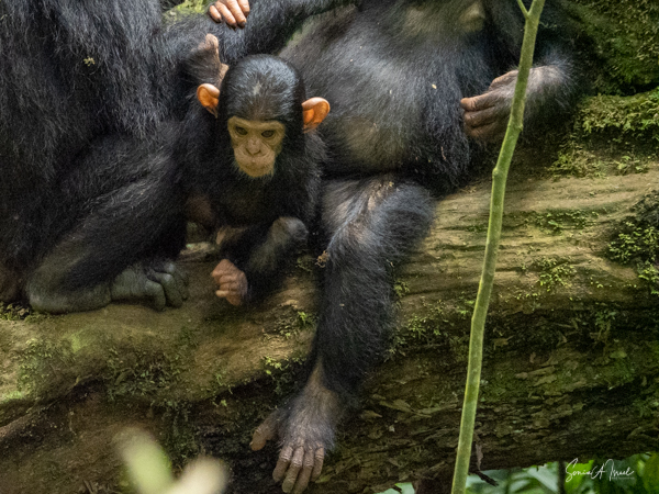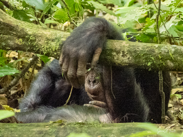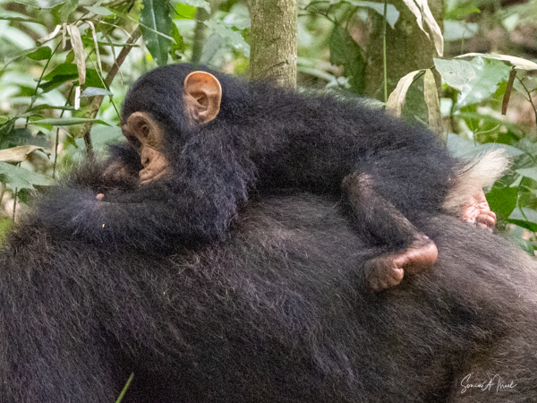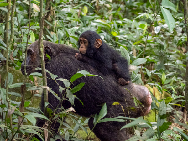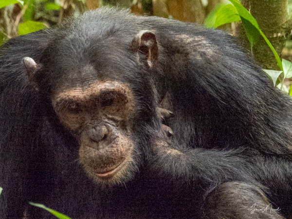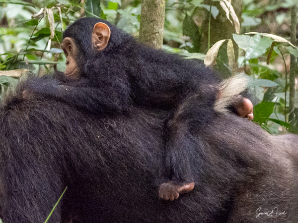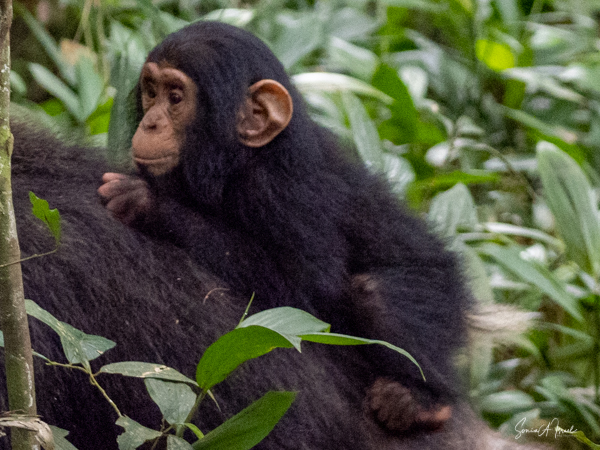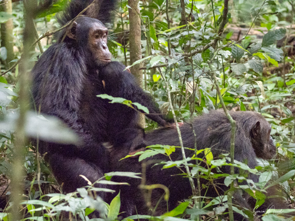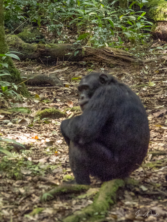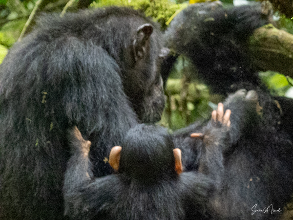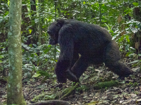 I should mention that although this trek is supposedly easier than the gorilla treks we would be doing, by the time we found the chimps, I felt weak and faint. Gordon and Paul sat me down on a raincoat placed in a shady spot under a tree, on top of the vines and leaves. I drank some water, as likely I was dehydrated (and jet lagged and hot). I did start feeling better, but I also missed some of the action of the chimps. But, while sitting there recovering, one chimp ran right by me. And why was he running? He was off to mate with a female chimp. And the baby clung on to the back the entire time, although copulation between chimps is very quick.