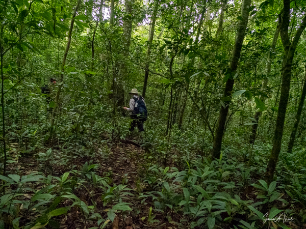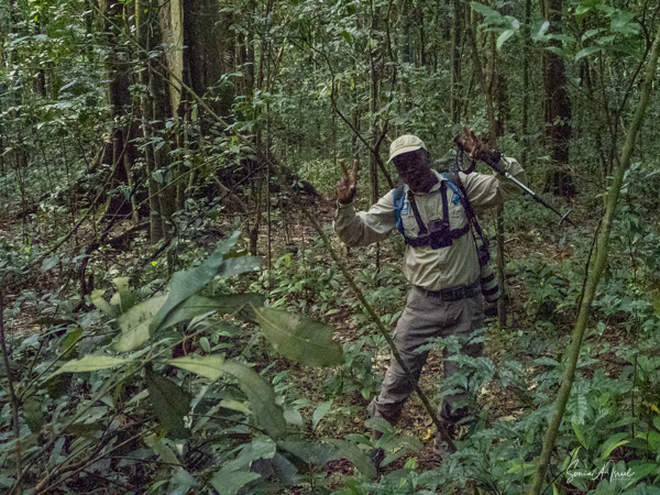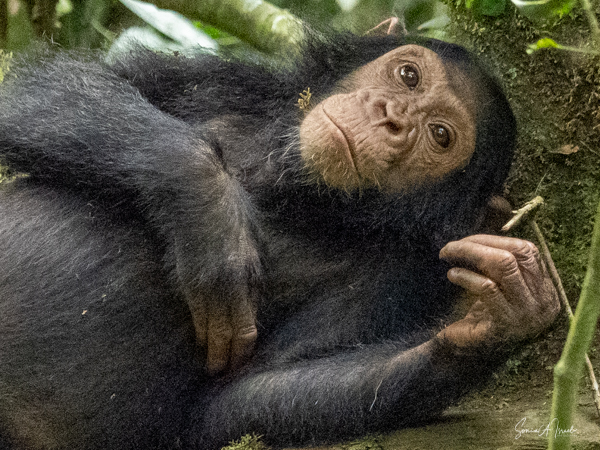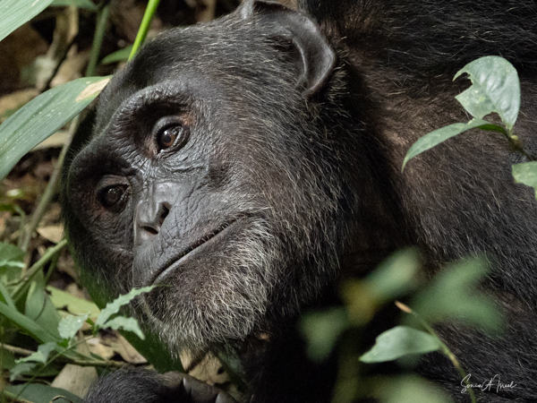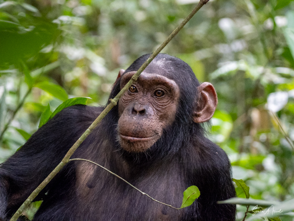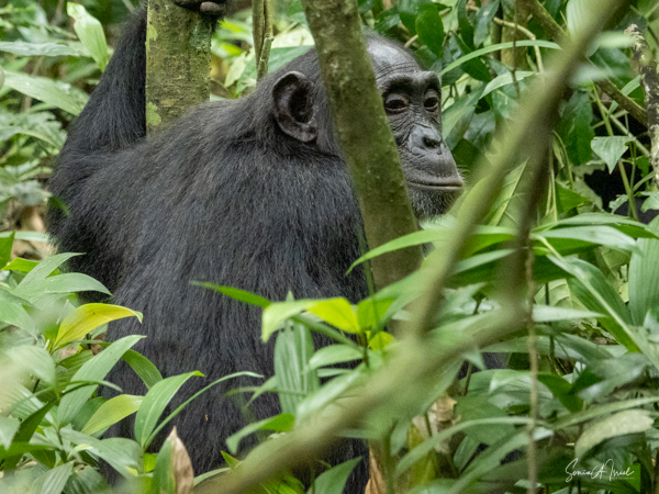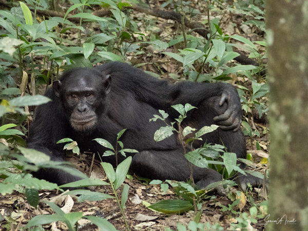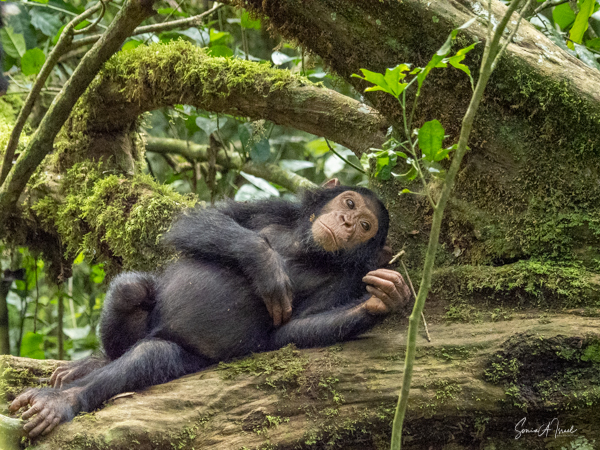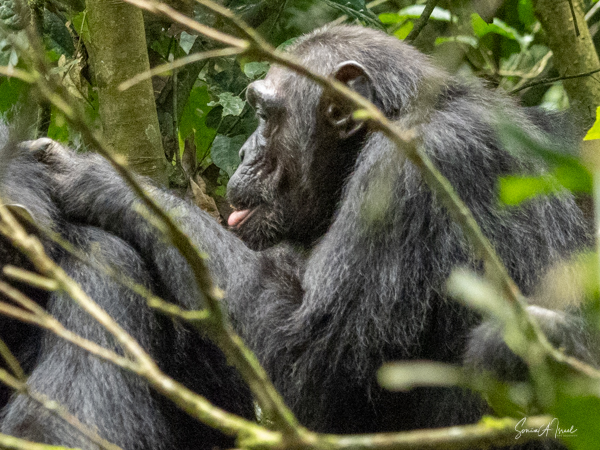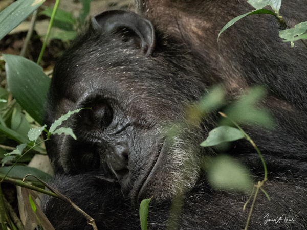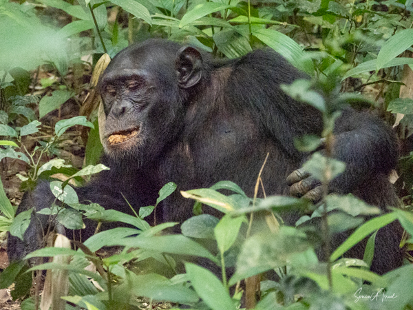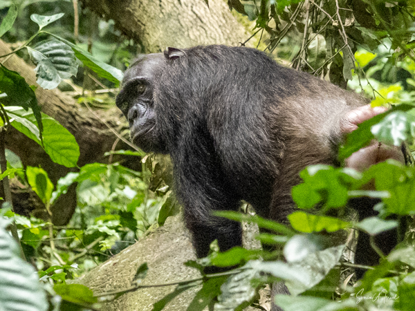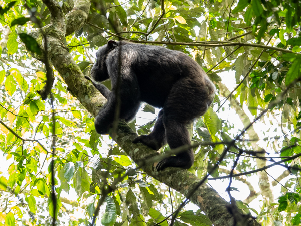 We found some chimpanzees, this time deep in the trees and bushes. Jessica would machete leaves out of the way to make it easier for us to see them. They were indeed less active than in the morning, but still eating. The babies were climbing all over the trees, hanging by one arm or the other.