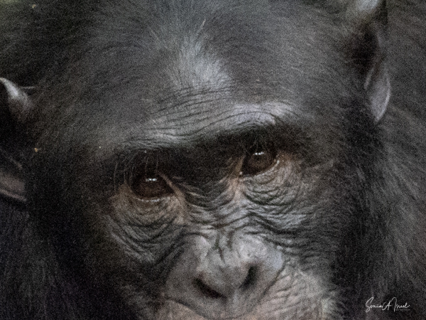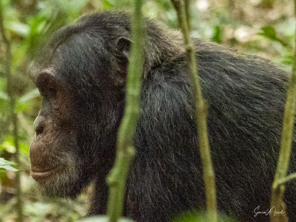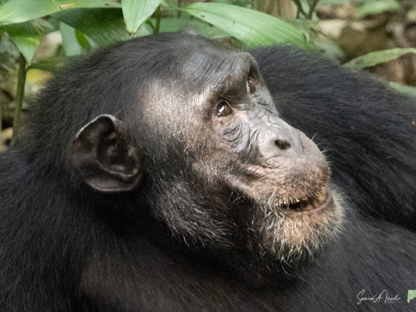 We found our chimp community deep in the forest, deep in the trees. They were covered in coarse hair, mostly black but sometimes more brown or reddish. Their faces were hairless, except for what looked like a straggly beard. We learned that as they age, just like us, their hair can become gray in spots and they can lose their hair and develop bald spots.