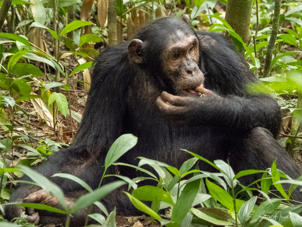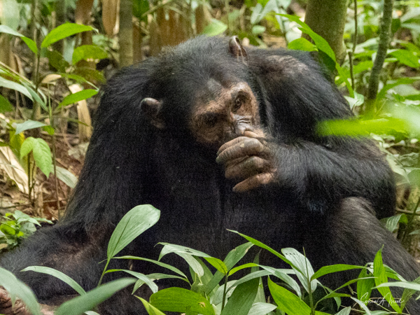 While there are chimpanzees (Pan troglodytes) all across Africa, it is estimated that there are about 5000 in Uganda, second only to the Democratic Republic of the Congo. The chimps have been tracked in Kibale since 1993 so the guides know how to find them and the chimps have been habituated to humans. There are treks staring at 8 am, when the chimps are most active, searching for fruit and eating, and at 2pm, when they are more sedentary. We did both. The duration of the treks vary, of course, depending on where the chimps are at any given moment, but in general can last between 2 and 5 hours – one way!