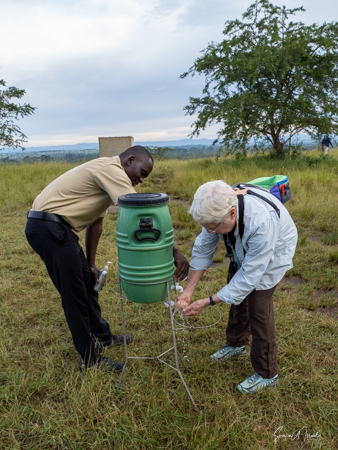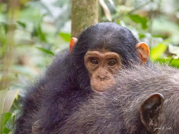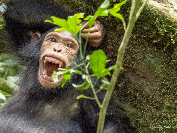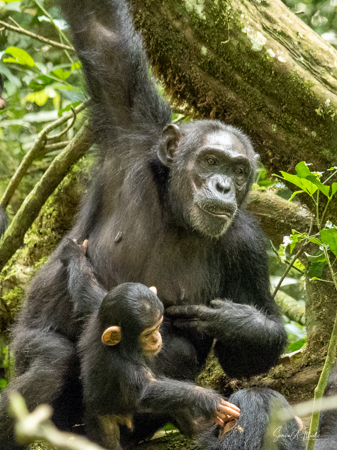 DNA studies have shown that chimpanzees are our closest living relatives. And they are so smart. For example, if they are ill, like with stomach problems, they will find the Warburgia ugandensis tree, also called the Ugandan greenheart. This is an evergreen tree that is believed to be antimalarial, antifungal and antibacterial.. And the chimps eat the fruit to cure their diarrhea. This is the same tree we saw in the Botanical Garden in Entebbe which has been found to be an effective treatment for COVID. The guides watch them for a few days, and if they are not better, they call the local vet. They have to follow the sick chimp until he is alone, and then they dart him and treat him with antibiotics. If they dart him in sight of the others, the rest of the community will think he was killed and would attack and they would lose all trust of humans. And almost all chimps have been seen using tools, such as sticks (which they sharpen), rocks, grass and leaves for hunting, getting honey, catching termites, ants, nuts and water.