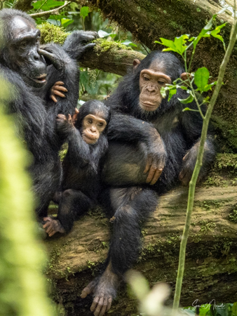 Unlike gorillas, who live in families, chimps live in communities which can range in size from 15-150 members. As long as they stay within their community, they are safe. It is only if they wander away on their own that they are in danger of being killed. Their main predators, for the babies, are eagles and snakes. For the adults, the main predators are humans. They are a male-dominated hierarchy and, unlike many humans, disputes are often settled without violence.