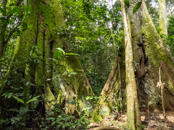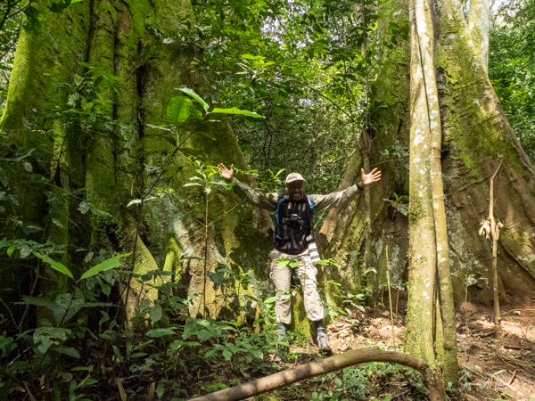 She also demonstrated how the chimpanzees stay in contact with each other by “drumming”, using their hands and feet to beat against the buttress roots of the ficus (fig) tree, also called the Balanites wilsoniana tree. We could hear them drumming and the other chimps responding with vocalizations. They sounded like they were saying “hoo” and the sound would get louder and louder, ending in what sounded like screaming or barking. The sound is piercing, and if I hadn’t learned otherwise, could be quite frightening. Jessica taught us that chimpanzees, in addition to sound, use facial expressions and postures to communicate. When they are frightened, what looks like a full closed grin tells the chimps around them to be fearful. When playing, they may exhibit an open-mouthed grin. They can pout (meaning I’m in distress) or sneer (meaning I’m threatened or afraid). When they are feeding or greeting each other, they grunt.