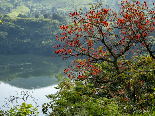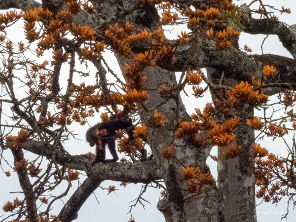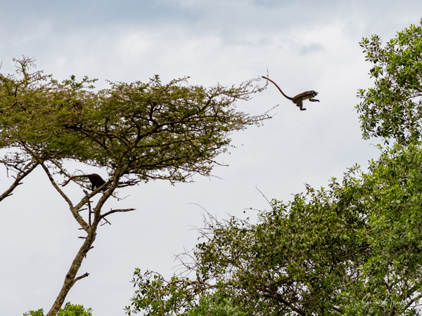 On the way back to the Ndali Lodge, we passed a beautiful coral tree filled with grey-cheeked mangabeys. These monkeys, also called the white-cheeked mangabey, are dark monkeys who look a bit like a small, hairy baboon. Their fur is thick and dark brown with a slight golden mane around their neck. They were silhouetted against the sky and often all we could see was their backs and their long tails. They would sit and eat for a bit, then fly through the sky to another branch or tree.