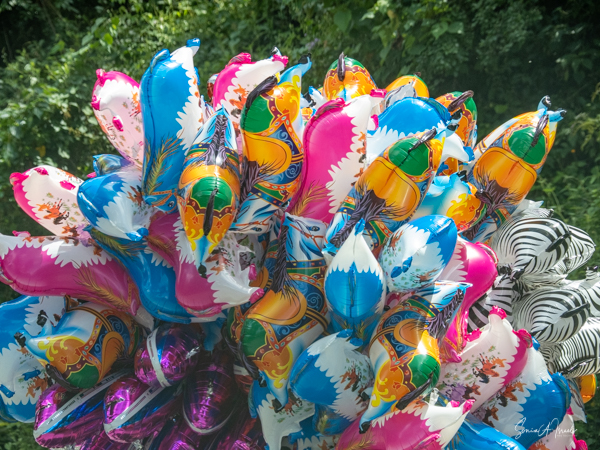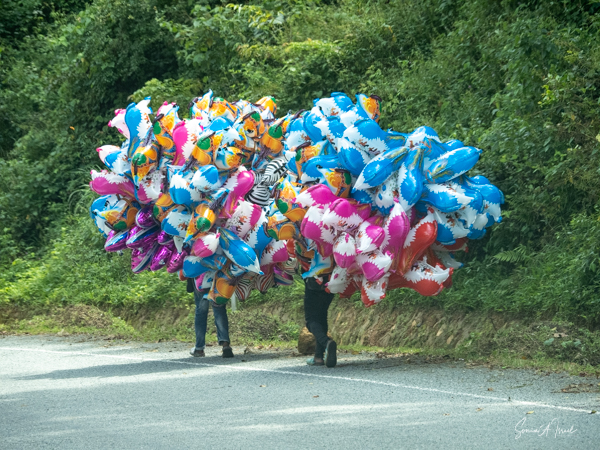 In addition to baboons, we saw something quite unusual on the road this time. From the distance, we couldn’t tell exactly what it was, but as we got closer we realized it was balloons. Lots and lots of balloons being carried by two men. That was a first for both Paul and Sulai. We of course have no idea where they were taking them, but I would venture to say they were hoping to sell them to some appreciative kids.