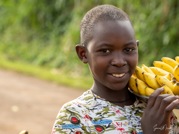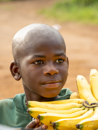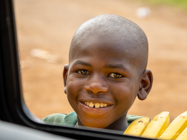 It was a long full day. We were exhausted and it was only 4:00. As we drove back over the dirt roads, making our last turn towards our lodge, a group of young boys, carrying bright yellow bananas, ran towards our car. Usually Sulai would not have stopped. But this time he did, although I have no idea what compelled him to do so. But what a treat that he did. The boys came up to our windows, holding out their wares, and what faces! What smiles! Such exuberance. Paul couldn’t resist, and even though he told us we shouldn’t buy things from kids, he made an exception this time. And I must say, those bananas were delicious, but not as delicious as the look on the kids’ faces.