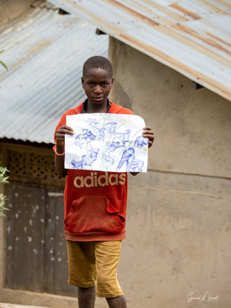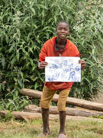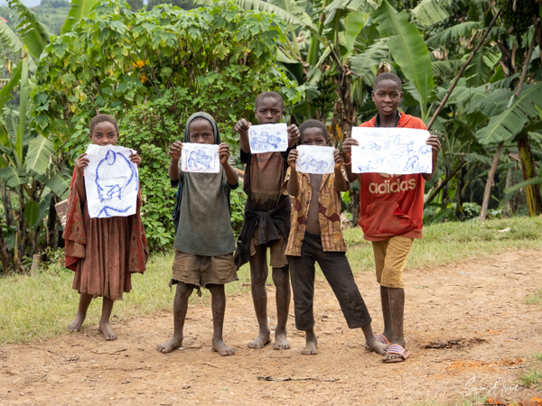 When we got back to the village, the kids where all there holding up drawings of gorillas that they were trying to sell, as well as statuettes of gorillas. While we were trekking, Sulai spent time with these kids. One young boy told him he bought the gorilla statue for 10,000 shillings and was going to sell it for 3,000. Sulai had to give him a math lesson to explain why that was not good business. These kids have lost so much by not having school for two years. I would have bought them all, but Paul cautioned us against giving kids any money. If their parents felt they could make a living, they would never be sent to school.