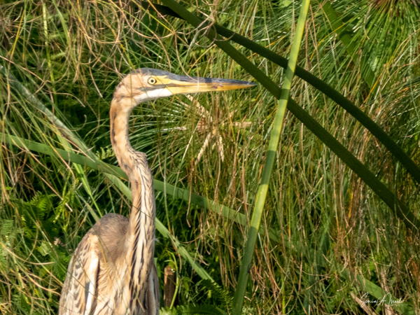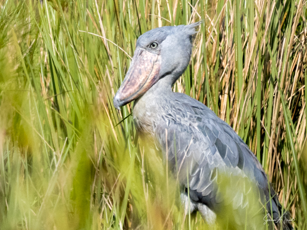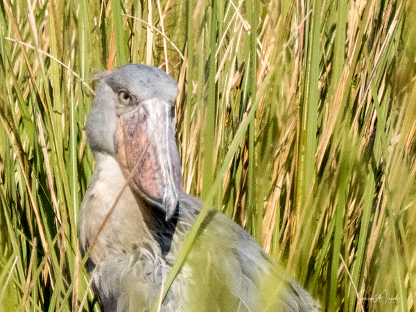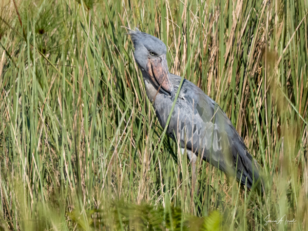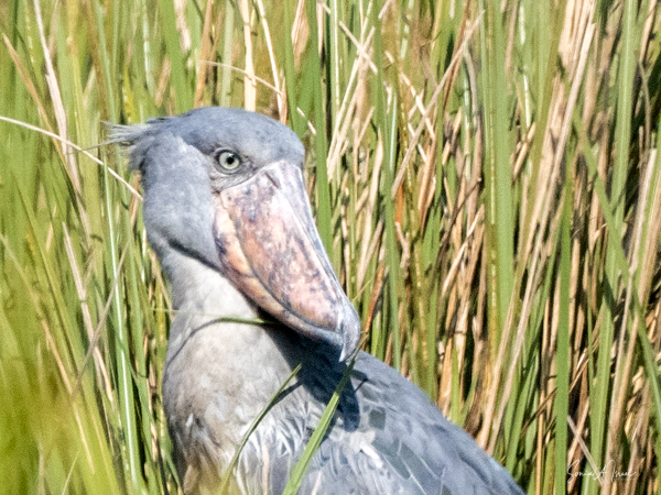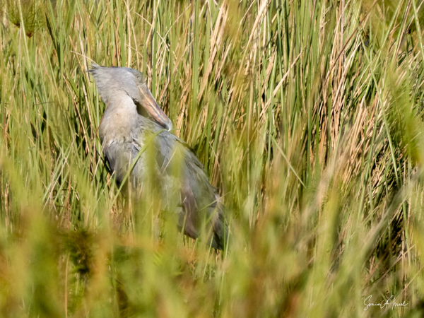 We motored for a bit, and then were pushed by the guys deeper and deeper into the marsh. They had me stand up on the boards and look far into the distance. At first I couldn’t see a thing, but then suddenly I focused on some gray sticking out between the green. It was a shoebill,