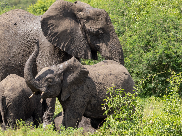 Two youngsters were wrestling each other, grunting and screaming out. One started jumping on the other. We had trouble seeing them through all the trees, but we suddenly saw one jump straight up and clearly land on the other. He did this several times. The other youngster ran to his mother for comfort and it looked like she told him to go back and defend himself, which he did. And the playing continued.