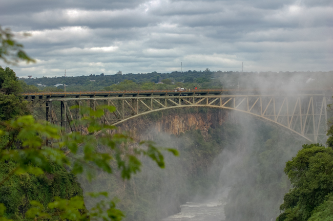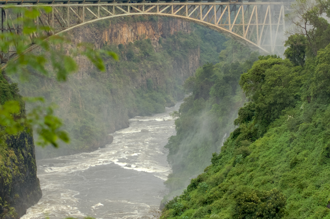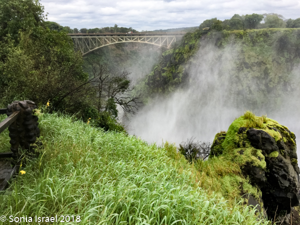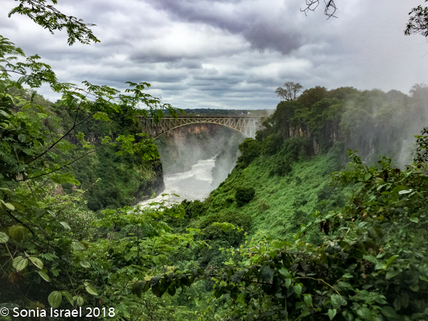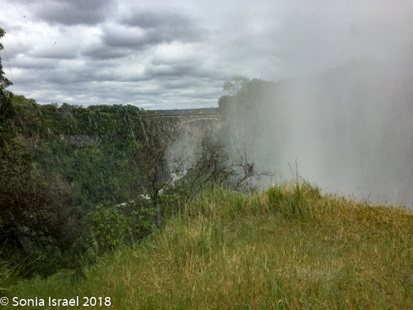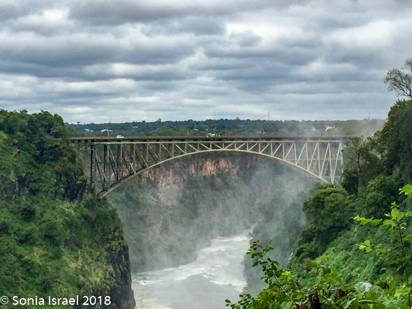 There is a beautiful old arched bridge, with a parabolic curve, which links Zambia and Zimbabwe. I would have loved to walk across, but we didn’t have visas for Zimbabwe. The bridge was part of a grand plan to link the Cape to Cairo, all along Africa, but that never happened. The plan was that the spray from the falls would hit the train. We mostly could see it in-between raindrops.