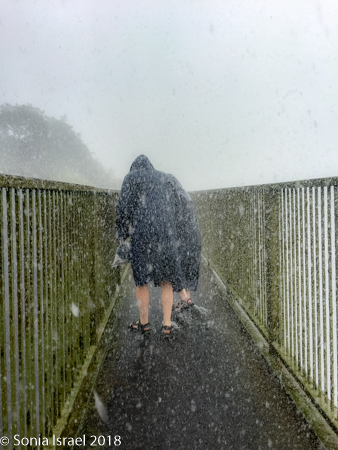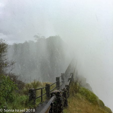 We began our walk, along the path running right across from the falls. The mist was so strong that it felt like it was pouring rain. Some call the mist “smoke (this the indigenous name). But for me it was neither mist nor smoke. It was a hard, almost painful rain. And yet, it was so strong, that it made us all laugh as we struggled to walk through it. And it was all being blown from the falls by the wind.