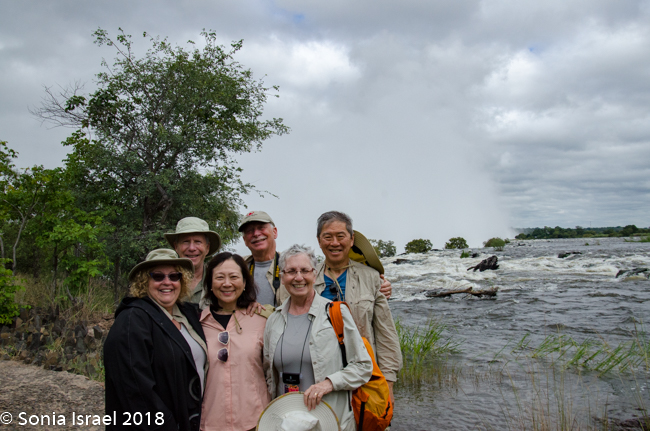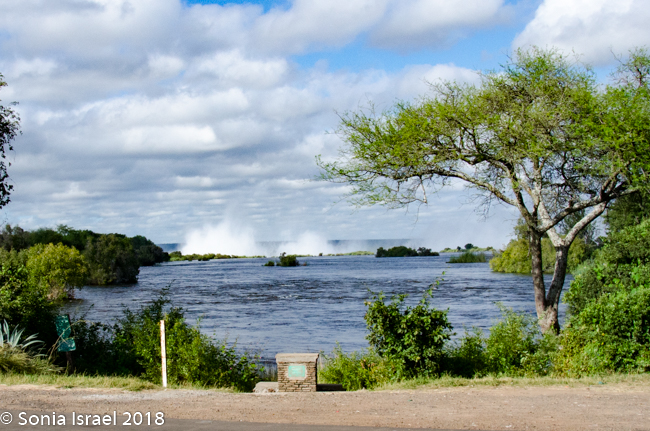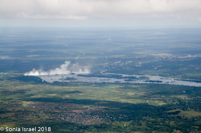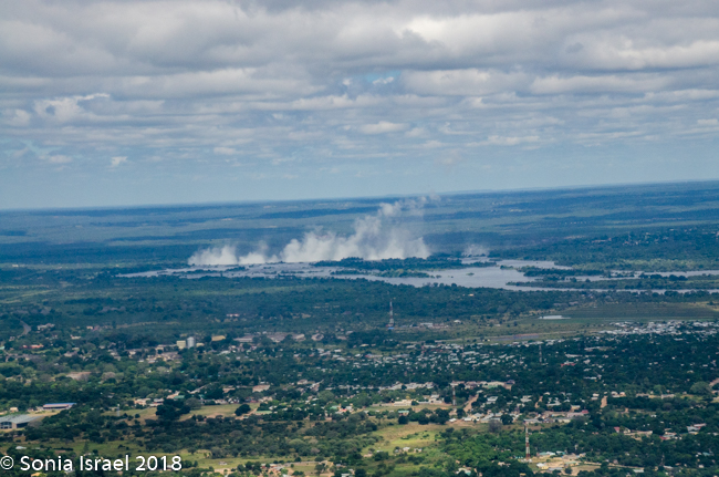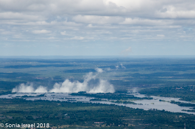 They say that the spray from the falls can rise up to 1300 feet or higher. It can be seen up to 30 miles away.  We did in fact see it both from the road on the drive to the falls, and then, a few days later from the airplane as we left Zambia.