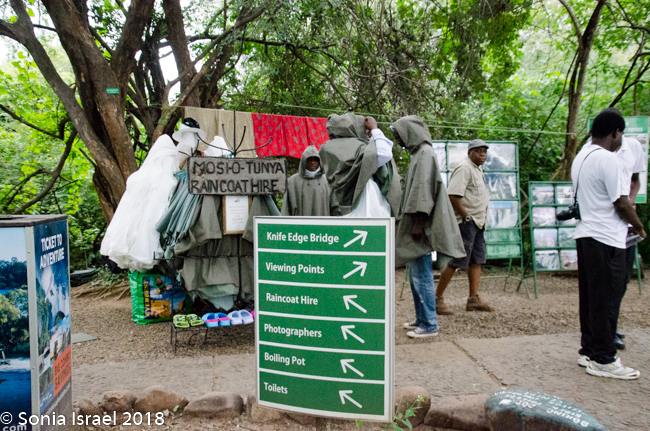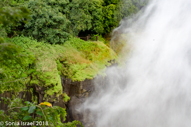 There is one view point where you don’t yet feel the mist and then you better put on a raincoat and cover your personal belongings, especially cameras.  We stopped next to a vendor who was renting raincoats for those that didn’t bring one. [Note that is also a good bathroom stop.]  I had a special waterproof backpack for my camera which I put on my back under my raincoat. I had my phone hanging on my neck in a waterproof pouch. Turns out that while that does keep the phone dry, the pictures all have raindrops on them. And even with the raincoat, by the end of our walk, we were soaked. Wearing a bathing suit might not be a bad idea!