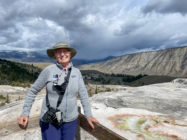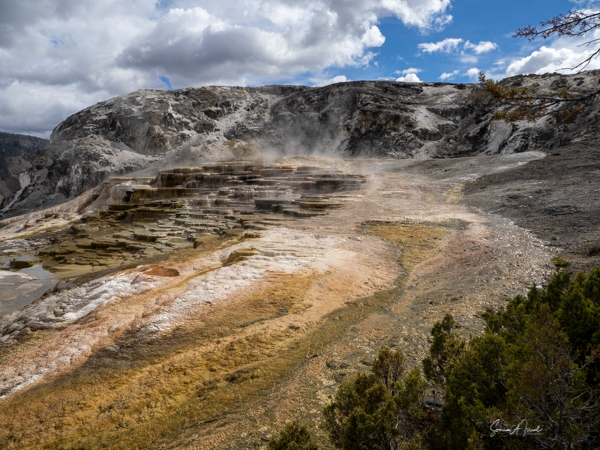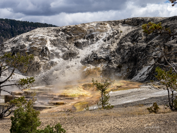 Our first view of the caldera and the thermal activity was in the Mammoth area. The Mammoth Hot Springs are just south of the North entrance, near Gardiner, Montana. The good news is that unlike many parts of Yellowstone, it is accessible all year round. We stopped first to observe the elk walking among the tourists (at a safe distance) and cars, as described in the wildlife post. Kurt then drove us to the top of the viewing area, dropped us off to walk down and meet him at the bottom. And there was a lot to see as there is little else like the Mammoth Hot Springs, as they are called. And no, you can not soak in them as most of the hot springs here are 200 degrees F or more.