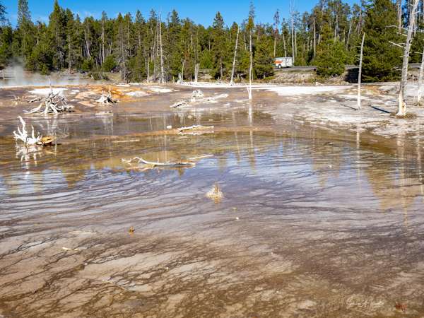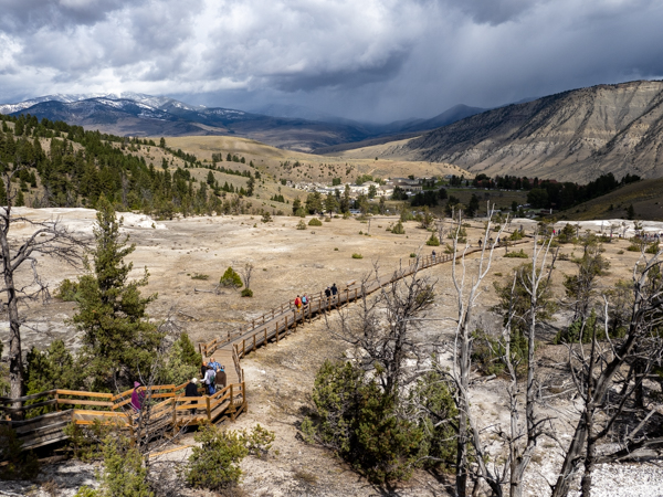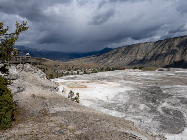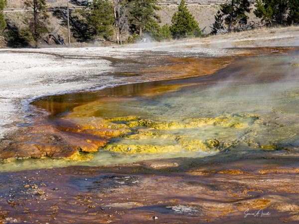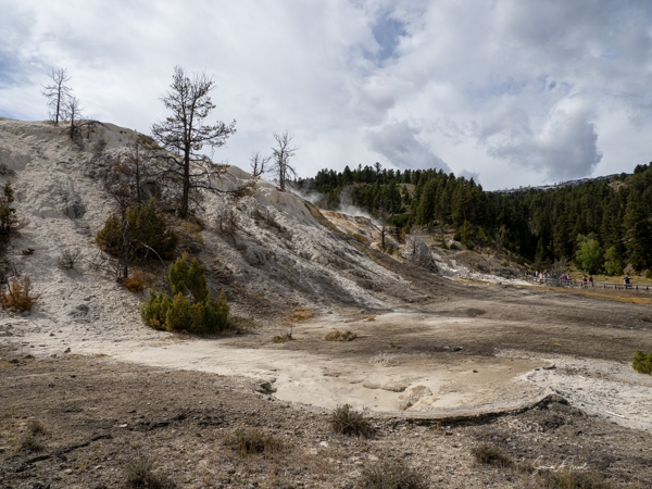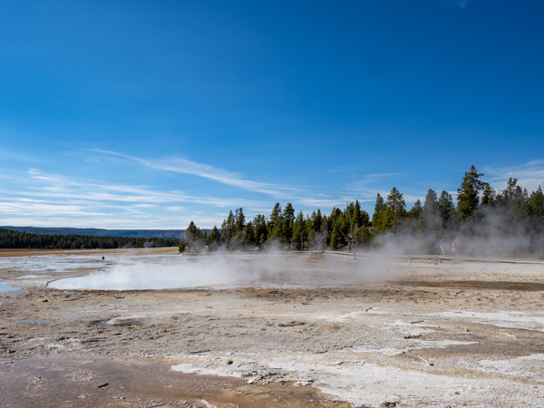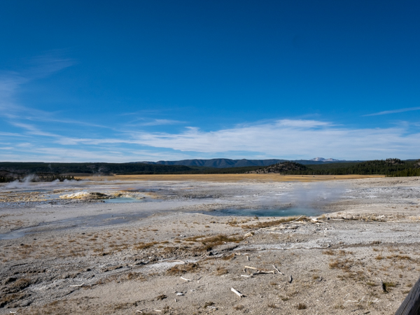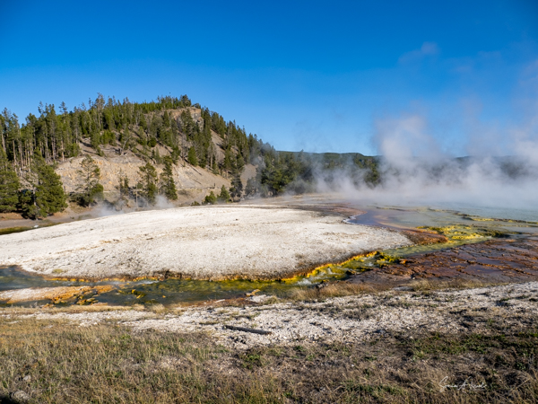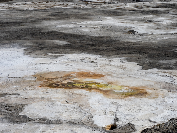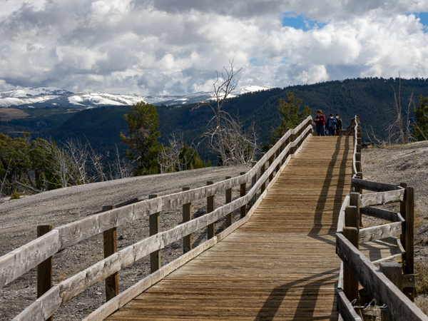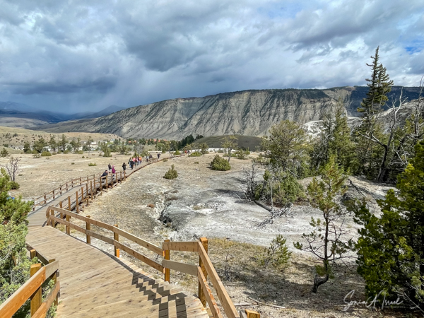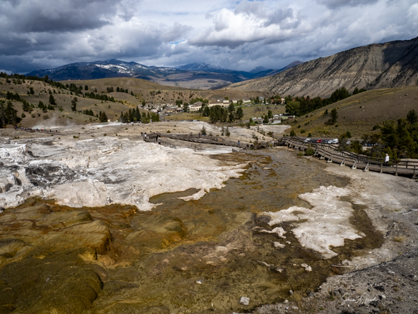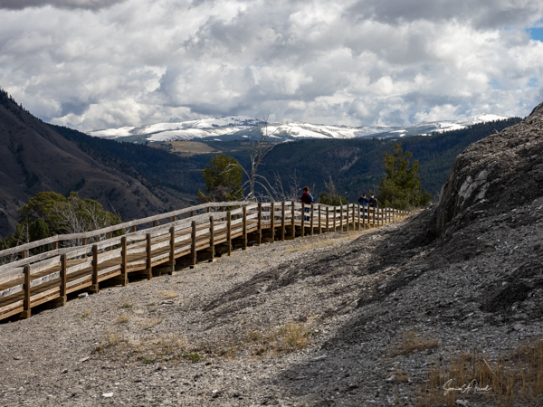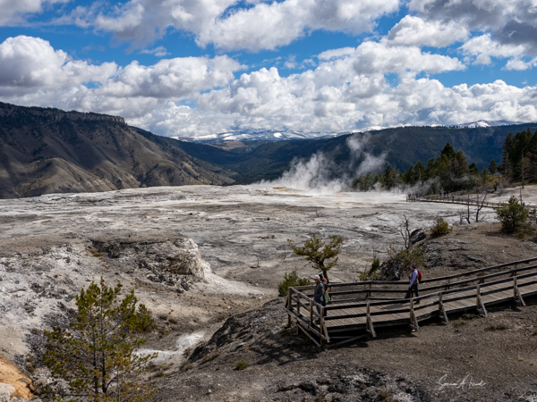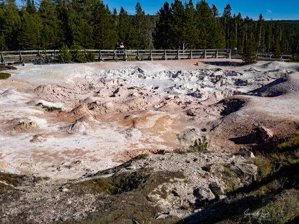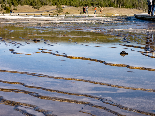 There wasnât enough time to keep walking on the Lower Boardwalk, but in the distance, I could see Palette Spring with its white and brown mounds and steps and formations, almost like a combination of many of the other hot springs. Each spring had its own beauty to it.