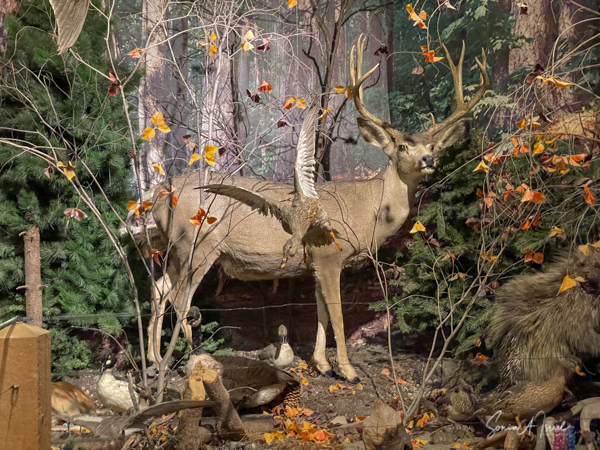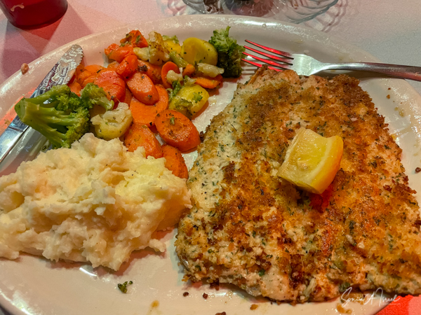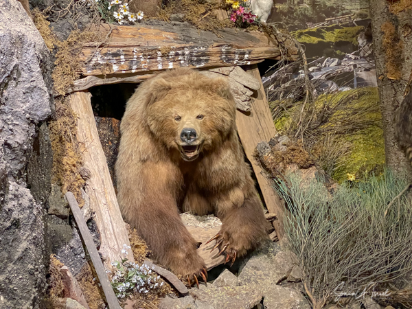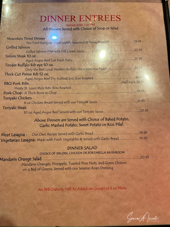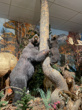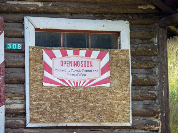 We arrived at the hotel early as it already had been a long day, so before dinner, Debby and I went for a walk to explore the few blocks of this town. As we walked out, it began to snow with light flurries, and our hands and ears were cold. So we dashed back inside to get hats and gloves. By the time we got back outside, the flurries had ended, the sun was out and it was warming up again. So we stuck our hats and gloves into our pockets and continued exploring. There was an old log house with a sign that a tuxedo shop would be opening soon. A joke? I can only imagine.