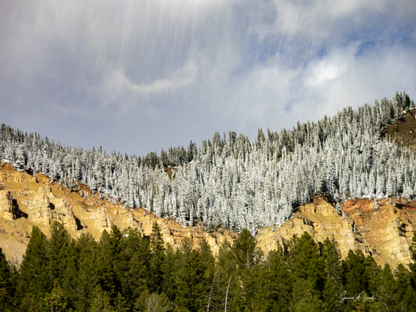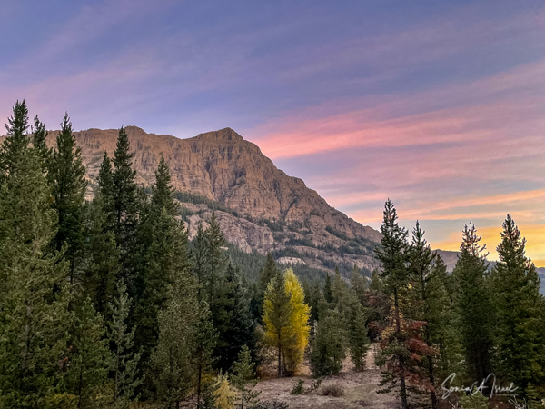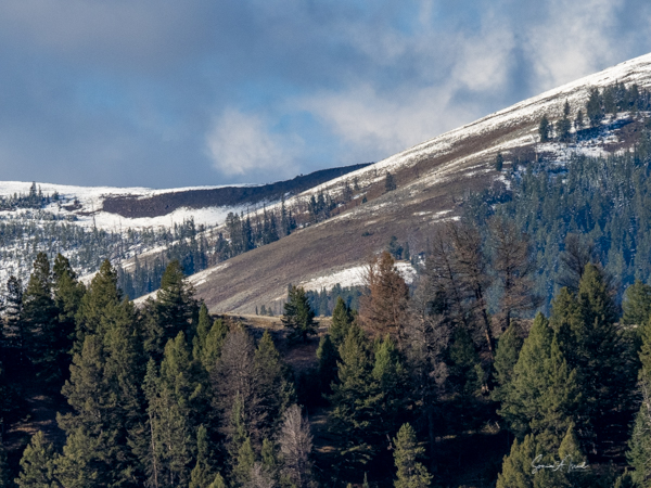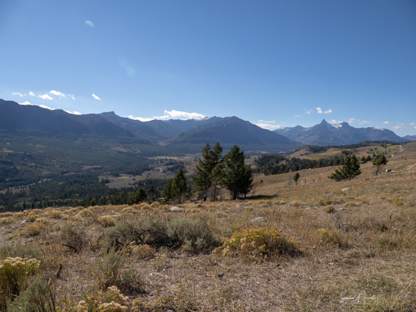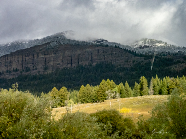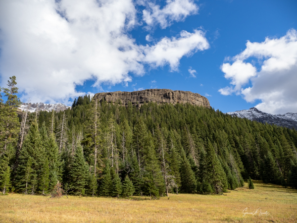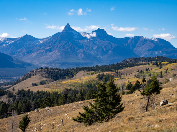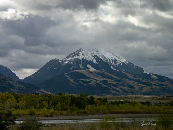 We often made stops on our journeys, not only to look for wildlife but to see beautiful views of vistas, mountains and valleys. One such stop was the view of Beartooth Mountain. Called “the most scenic drive in America”, the Beartooth Pass on U.S. Highway 212 has dramatic switchbacks traversing the spectacular Beartooth Range. The road climbs up 5000 feet through pine tress up to a view of alpine lakes as well as 20 peaks all of which are close to or over 12.000 feet. The road snakes up in tight zigzags and switchbacks that one can hardly see until you are upon them. And suddenly there is the vista point rest area, Clarkâs Fork Overlook, at 9190 feet. We jumped out of the car and walked down the walkway that led to the gorgeous views of the Clarks Fork River Valley and of the mountains beyond. And those mountains were part of the most amazing view of the almost perfect pyramid sticking up between the granite mountains. This is Pilot Peak, at 11,699 feet, carved by the glaciers that carved away the rest of the mountain, leaving just this pyramidal spire.
