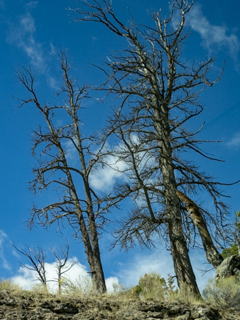 But nature is an amazing force. There are indigenous plants in Yellowstone that have adapted to the wildfires that are part of the natural ecosystem. Douglas fir trees have a thick bark which protects the inner parts of the tree from most fires. Lodgepole Pines have cones that only open when the heat from a fire melts the resin holding it together and thus seeds are dispersed. Other trees, like the Subalpine fir, Engelmann spruce and whitebark pine grow higher up in the colder, moister areas thus avoiding fires. And the Aspen tree, which we saw all over the park, sprouts new growth from its roots so even if the fire kills the tree, the roots will still survive.