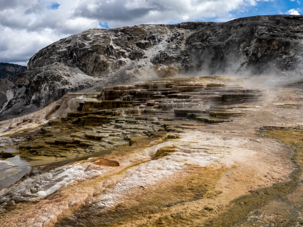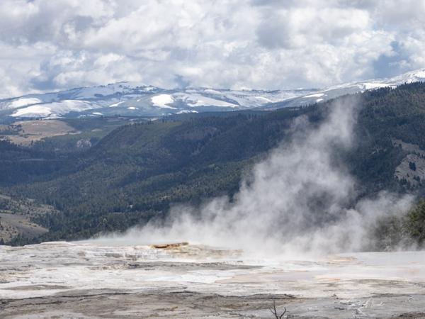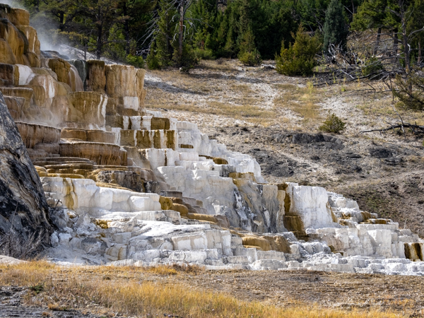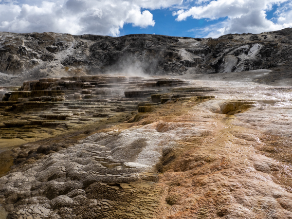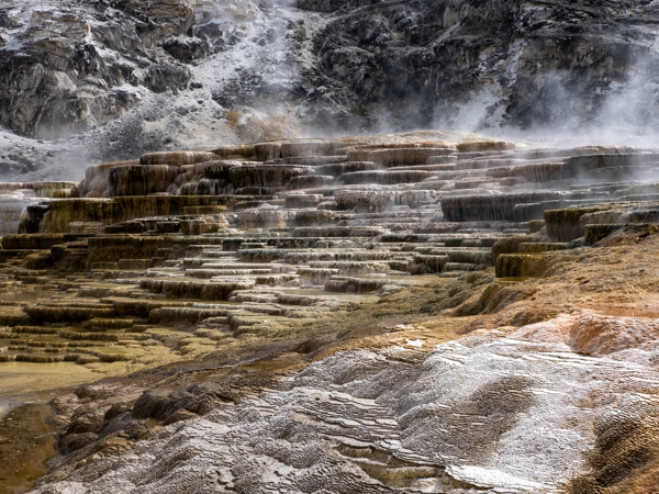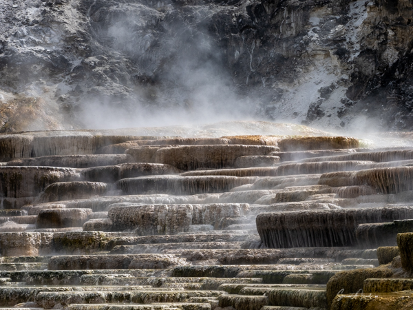 The cold rain and melted snow in Yellowstone seep into the ground and are immediately warmed by the heat from the molten magna chamber found underground. The water gets hot, moves throughout the underground system and then rises up through small fissures that have developed over thousands of years. The hot water interacts with the hot gasses being emitted from the magna chamber as well and these hot gasses are charged with carbon dioxide. As the carbon dioxide dissolves in the hot water, a weak, carbonic acid solution is formed. This hot, acidic solution then dissolves much of the limestone found in this area starting underground and making its way to the surface. Once exposed to air, the carbon dioxide escapes from the solution and the limestone hardens, forming a white, chalky mineral deposit on the travertine that forms the terraces. Since the limestone is soft, the travertine formations here grow much faster than other formations.