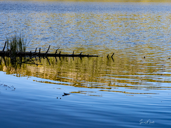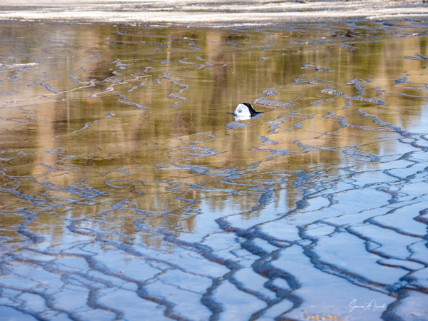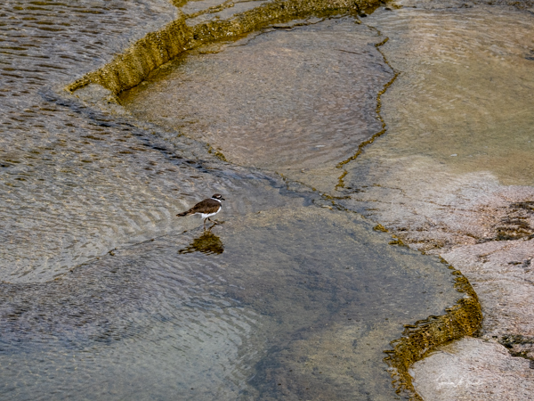 I didnât know which side of the boardwalk to look at first. On my left was a yellow/orange area â no, it was actually more like gold – that looked almost like a lake with big water lilies, except it wasnât a flower but rather a set of ridges. The sun was at just the right angle that the boardwalk was reflected in the water, as was I. And then I saw life. A small bird, making its way around the edges. I am not sure how it could stand the very, very hot water. Nature!